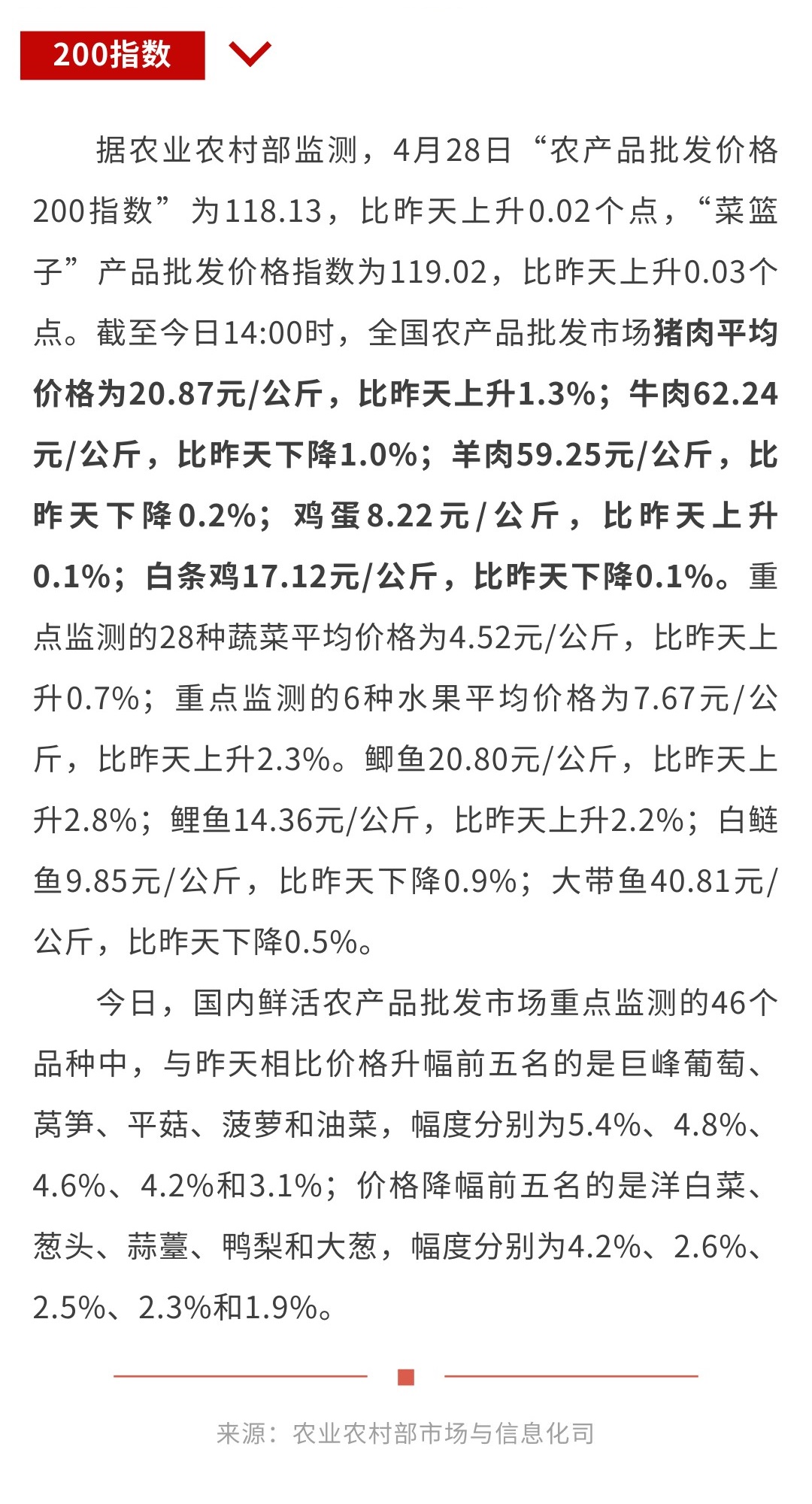 4月28日“农产品批发价格200指数”比昨天上升0.02个点