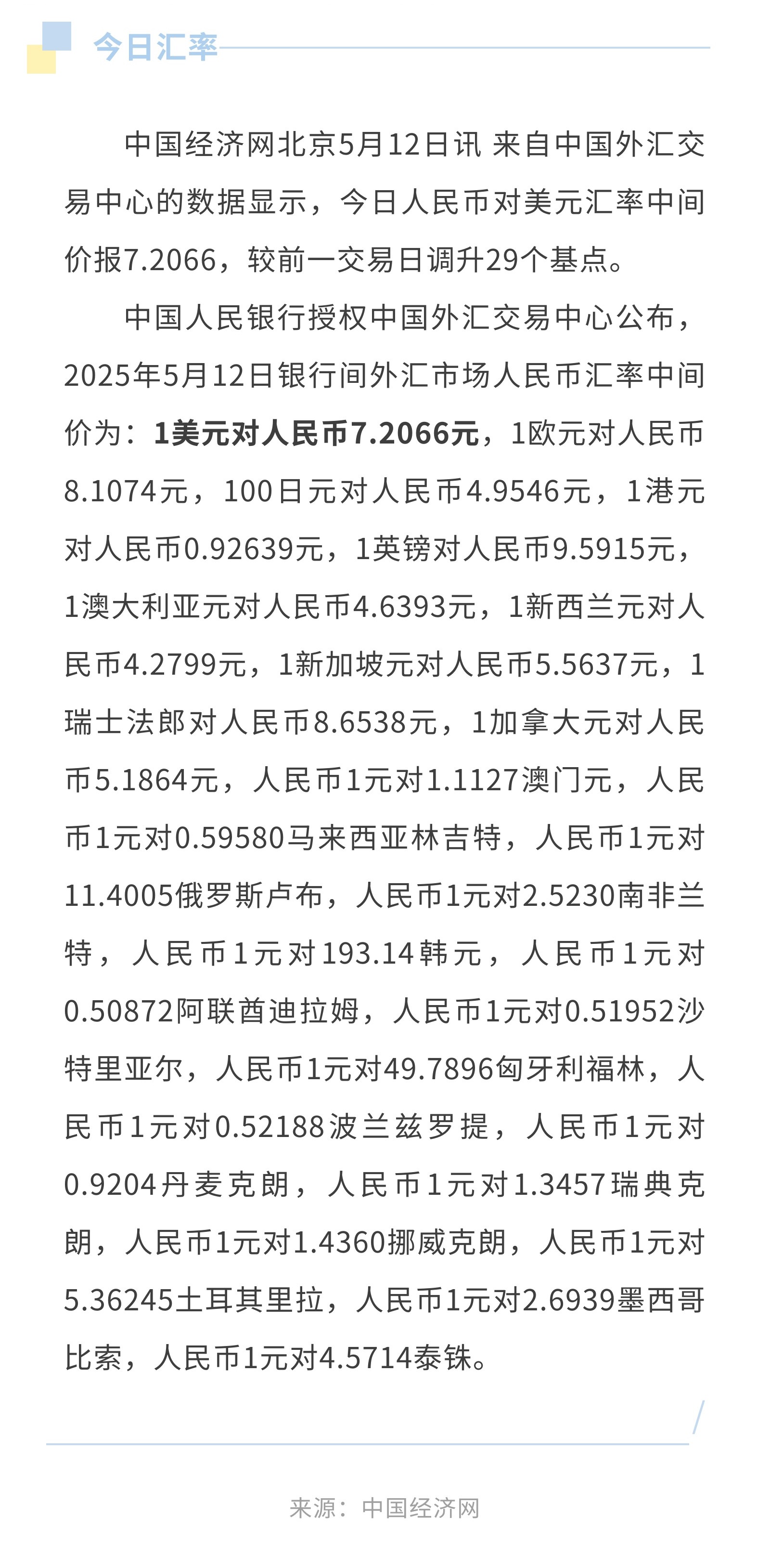 5月12日人民币兑美元中间价报7.2066,调升29个基点