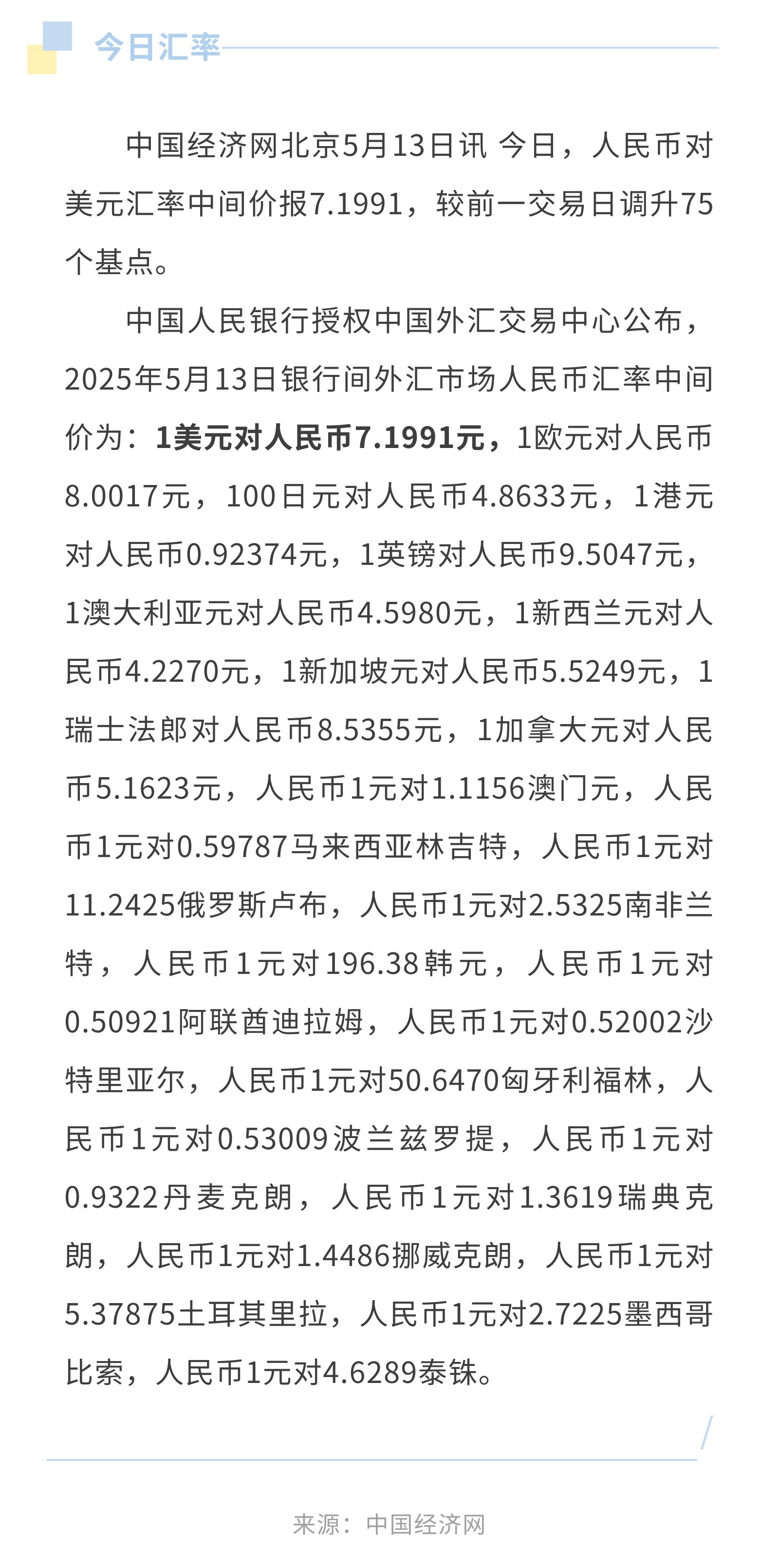 5月13日人民币兑美元中间价报7.1991,调升75个基点