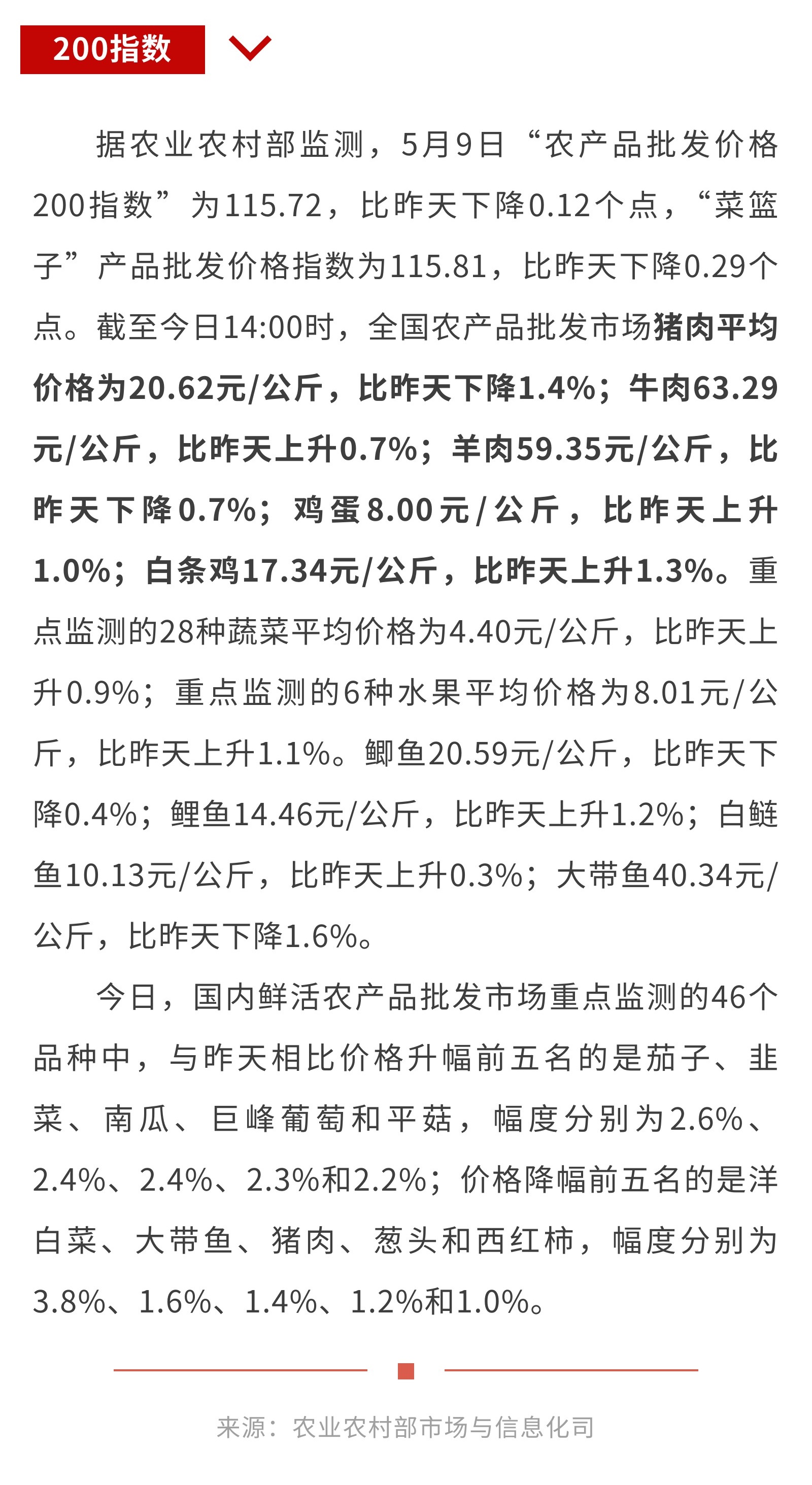 5月9日“农产品批发价格200指数”比昨天下降0.12个点