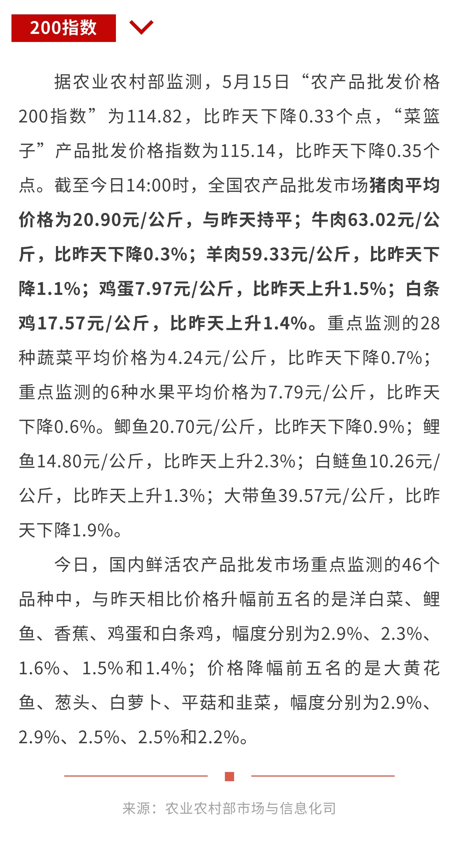 5月15日“农产品批发价格200指数”比昨天下降0.33个点
