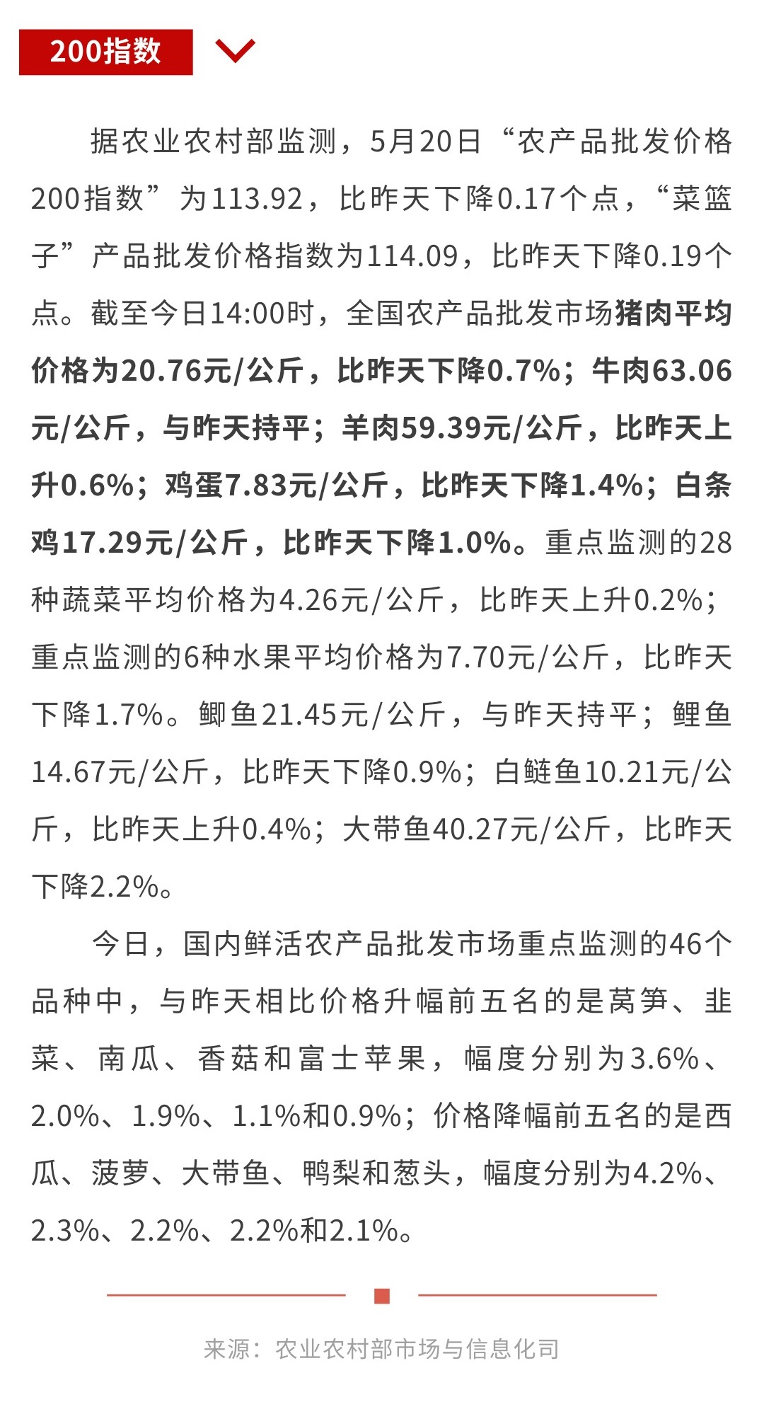 5月20日“农产品批发价格200指数”比昨天下降0.17个点