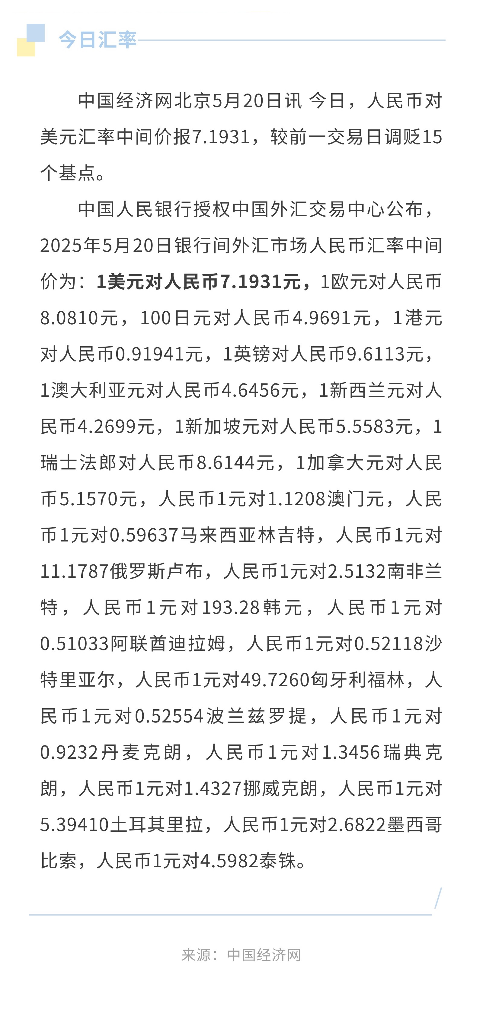 5月20日人民币兑美元中间价报7.1931,调贬15个基点