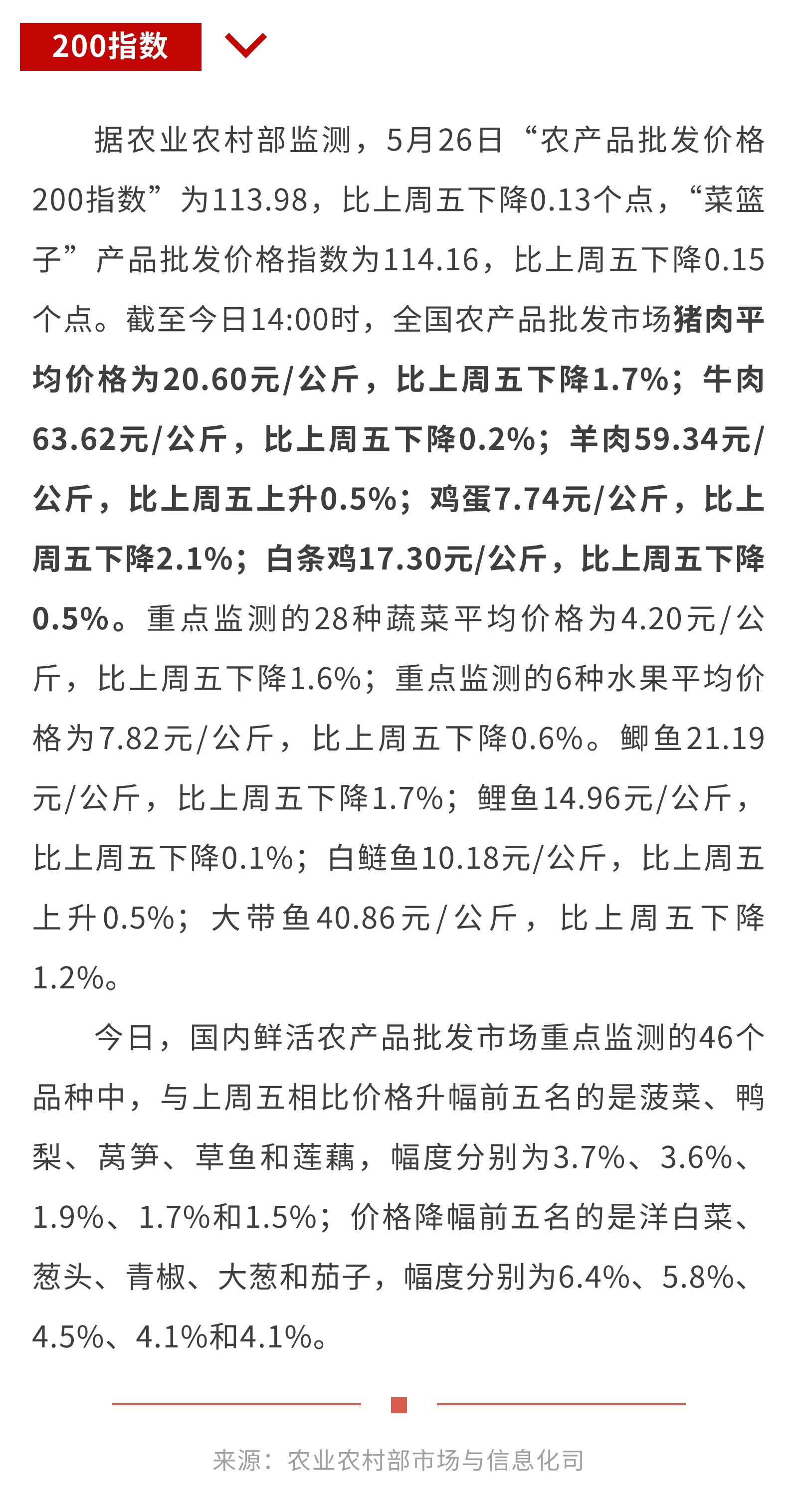 5月26日“农产品批发价格200指数”比上周五下降0.13个点