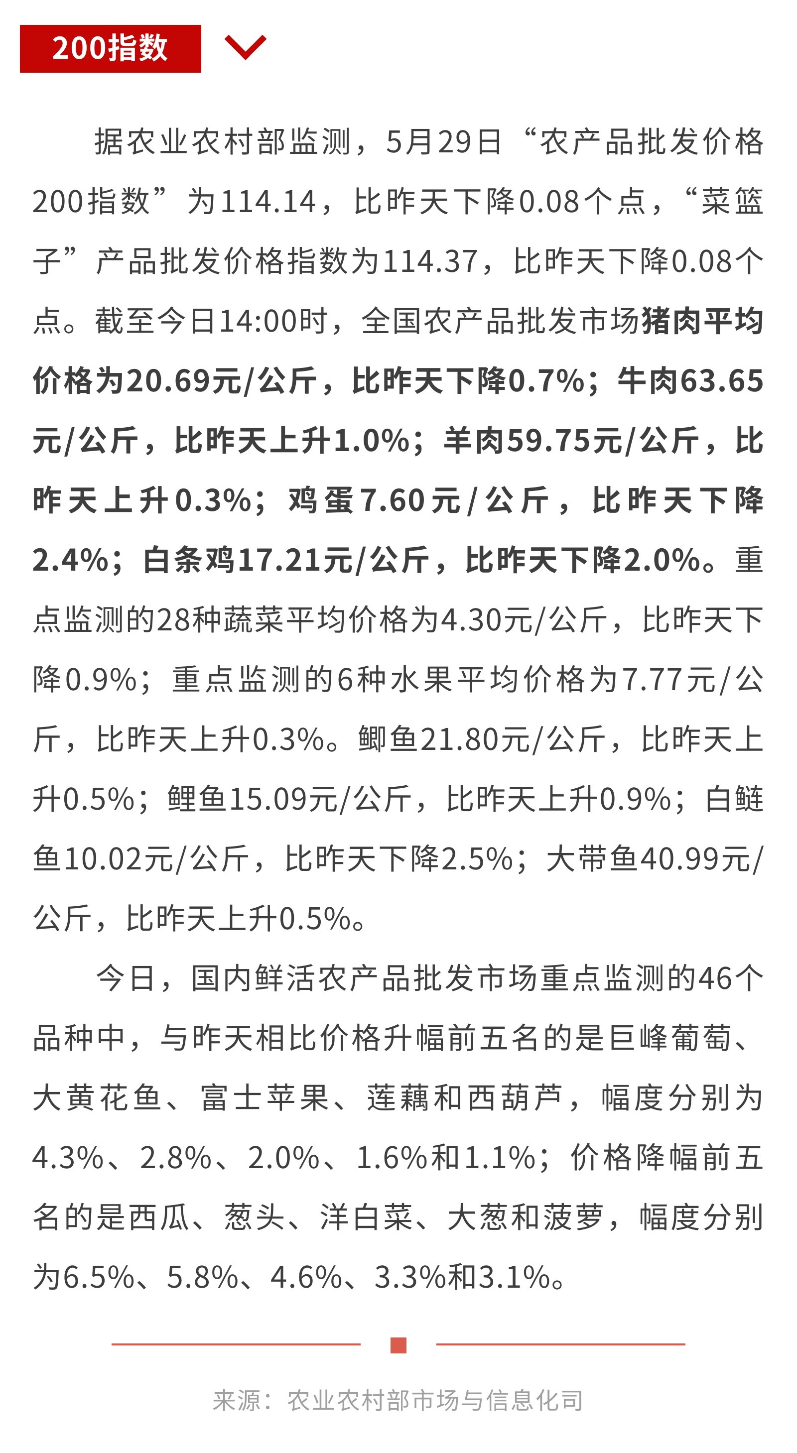 5月29日“农产品批发价格200指数”比昨天下降0.08个点
