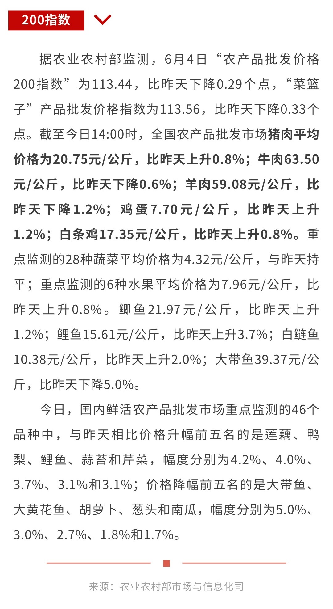 6月4日“农产品批发价格200指数”比昨天下降0.29个点