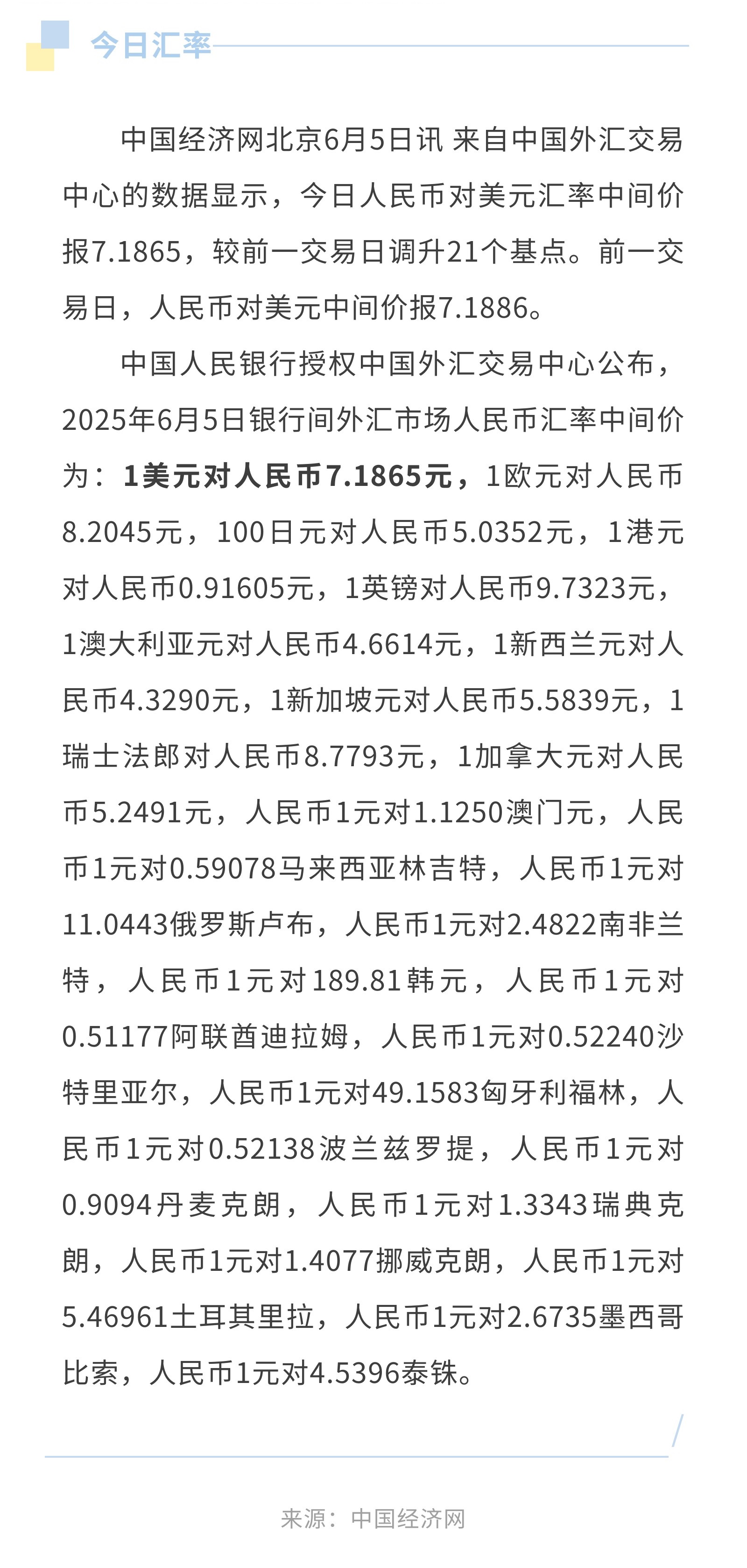 6月5日人民币兑美元中间价报7.1865,调升21个基点