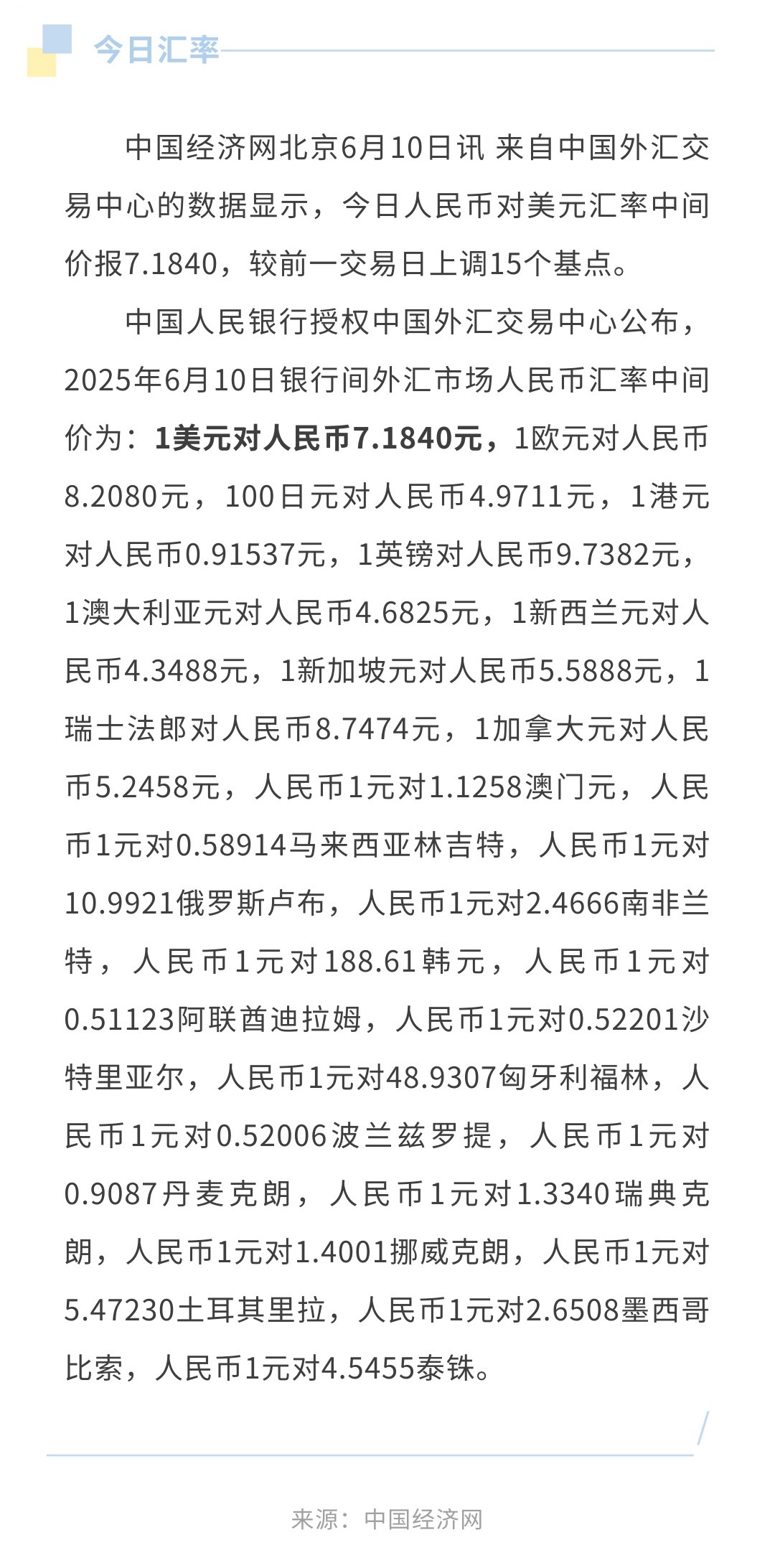 6月10日人民币兑美元中间价报7.1840,上调15个基点