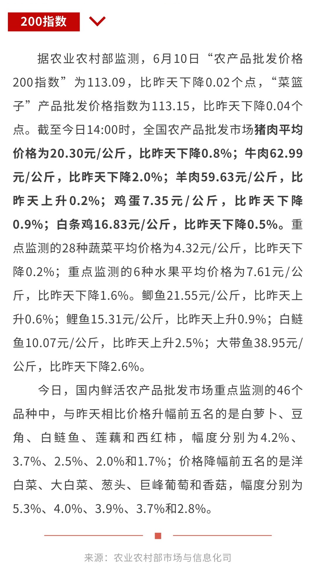 6月10日“农产品批发价格200指数”比昨天下降0.02个点