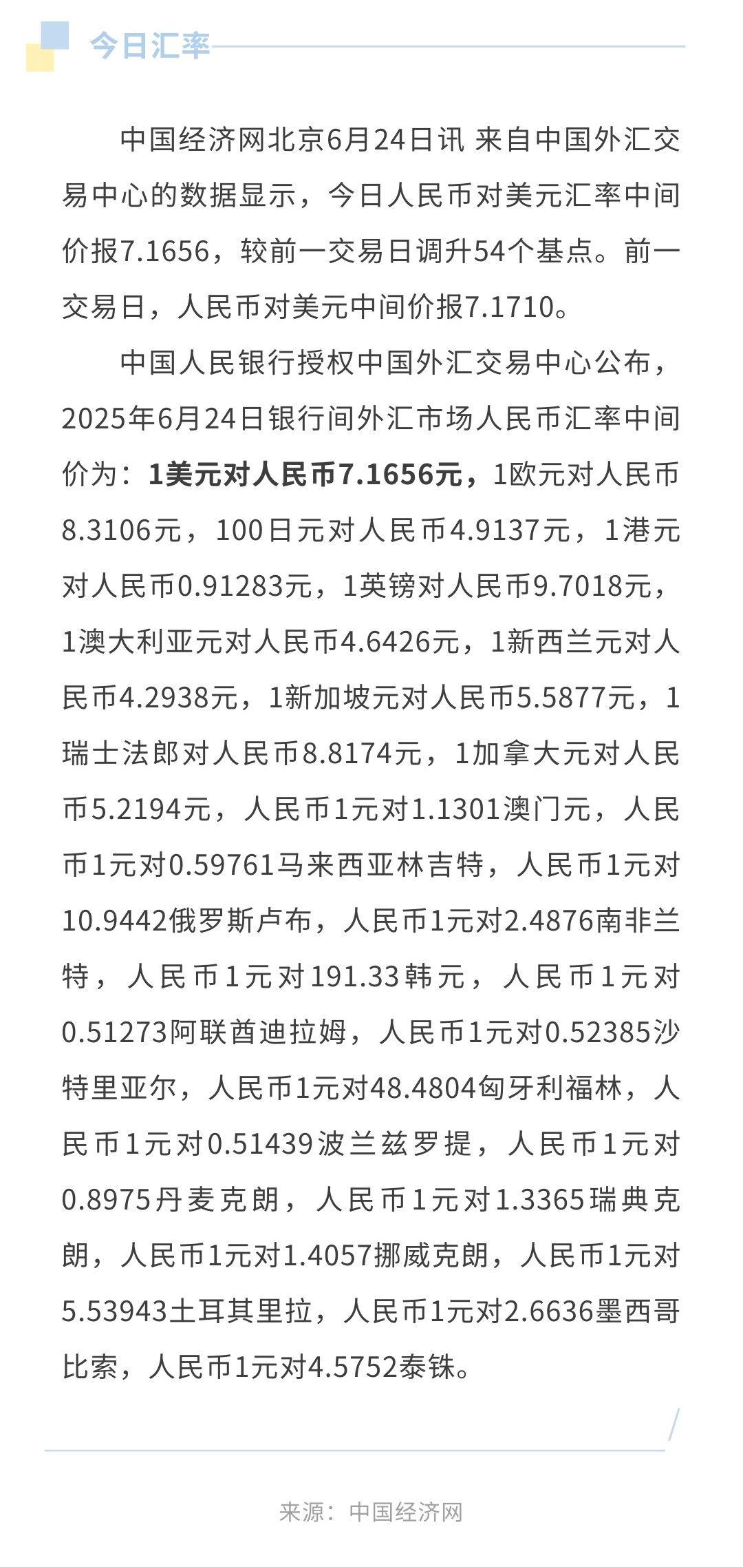 6月24日人民币兑美元中间价报7.1656,调升54个基点