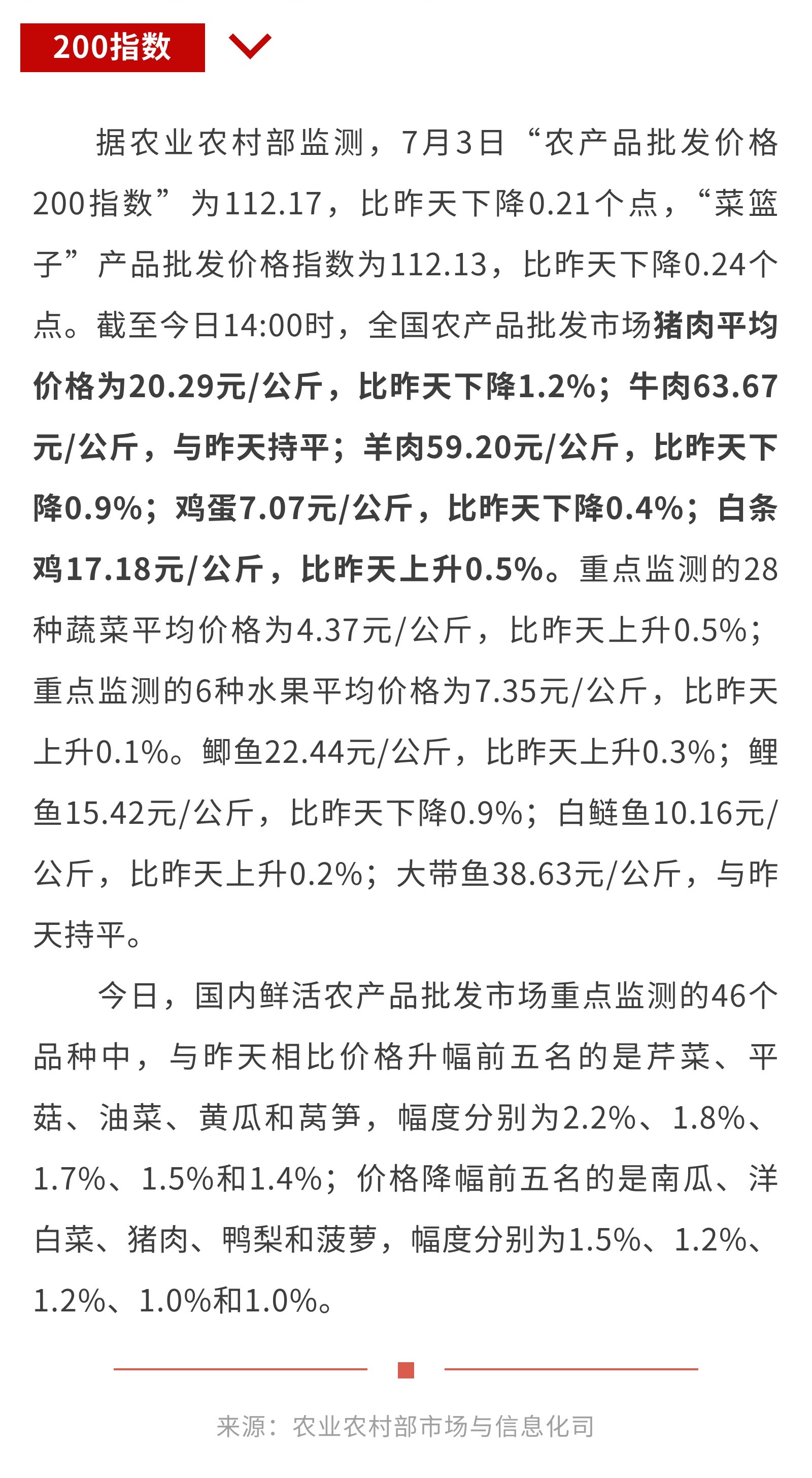 7月2日“农产品批发价格200指数”比昨天下降0.01个点