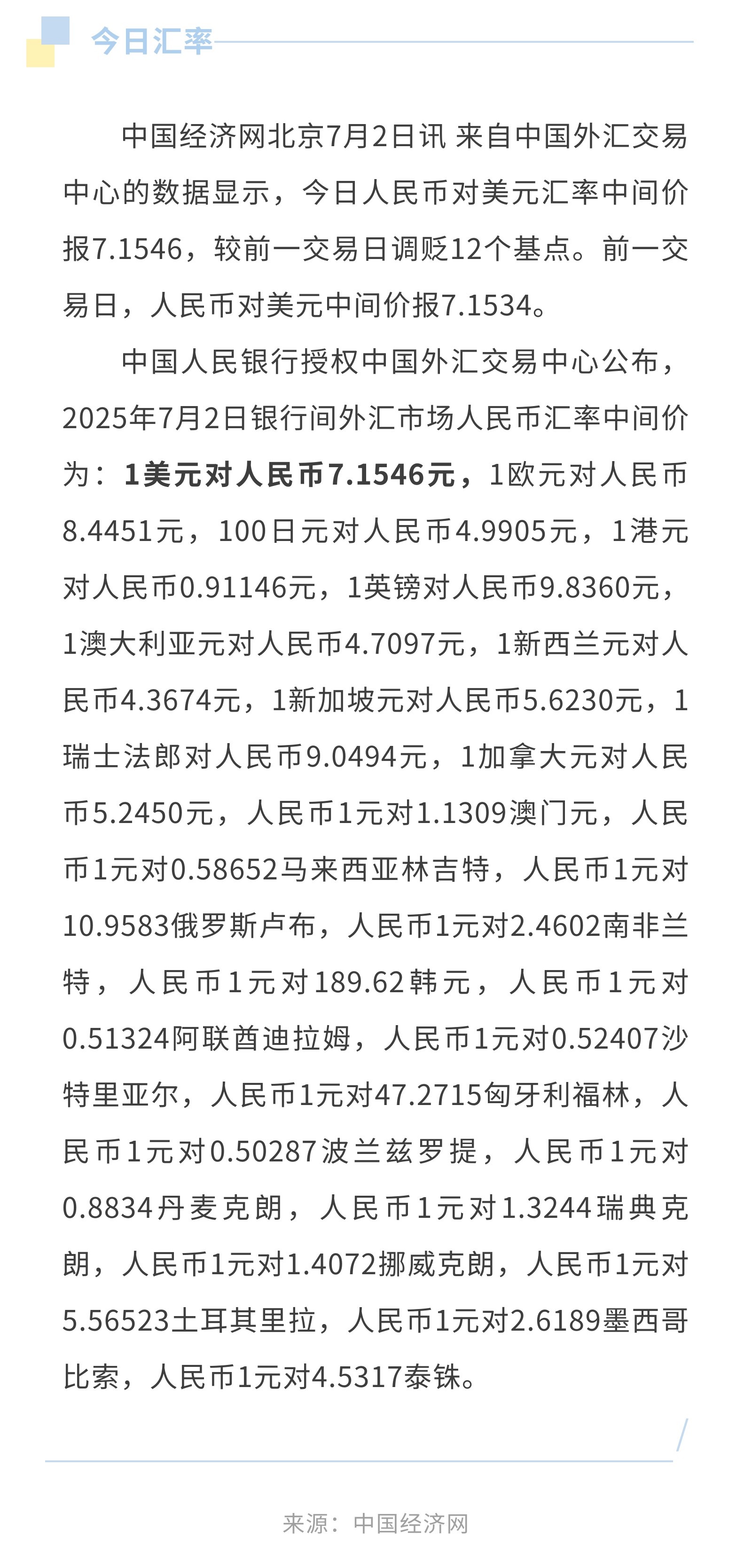 7月2日人民币兑美元中间价报7.1546,调贬12个基点