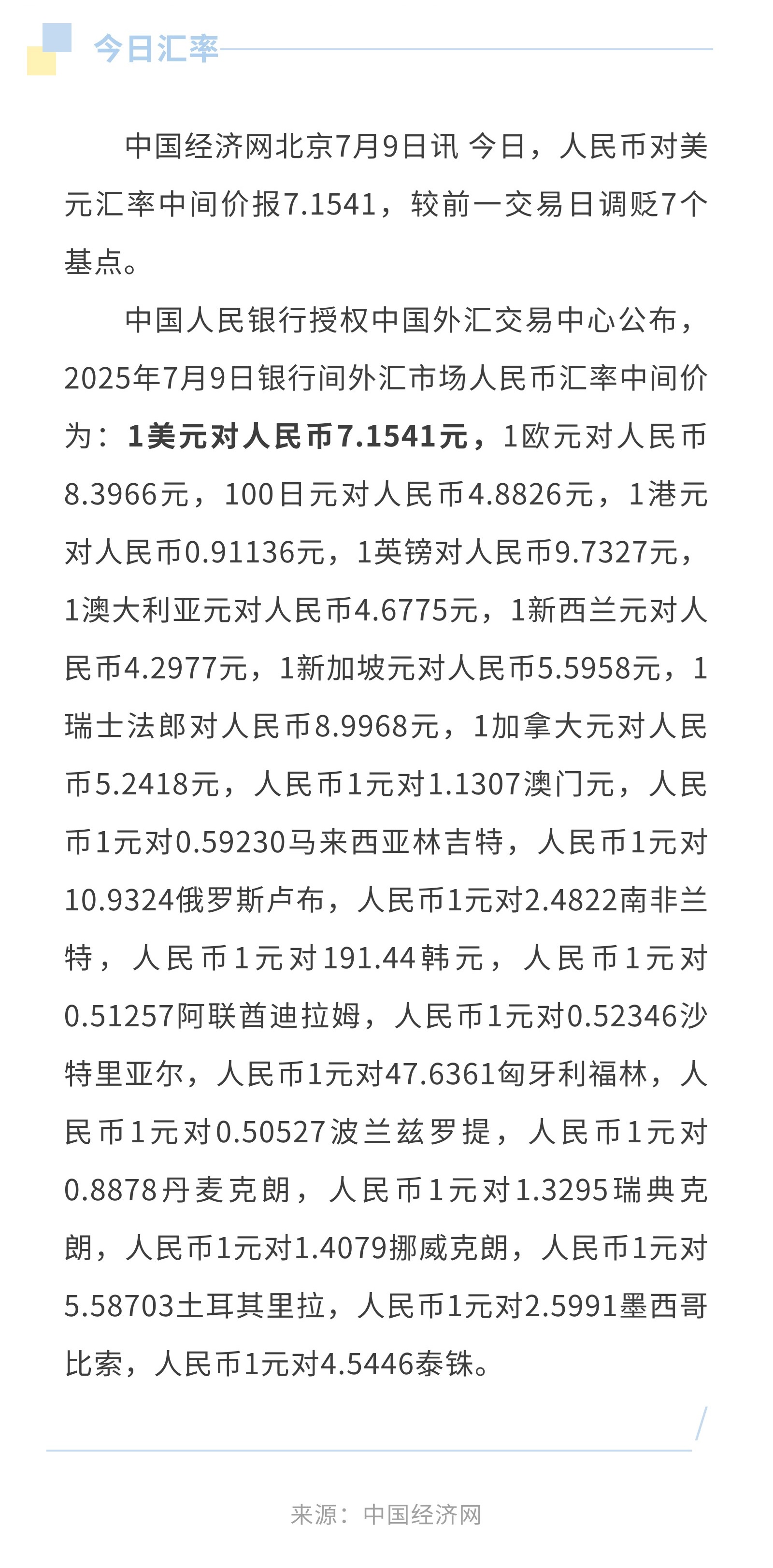 7月9日人民币兑美元中间价报7.1541,调贬7个基点