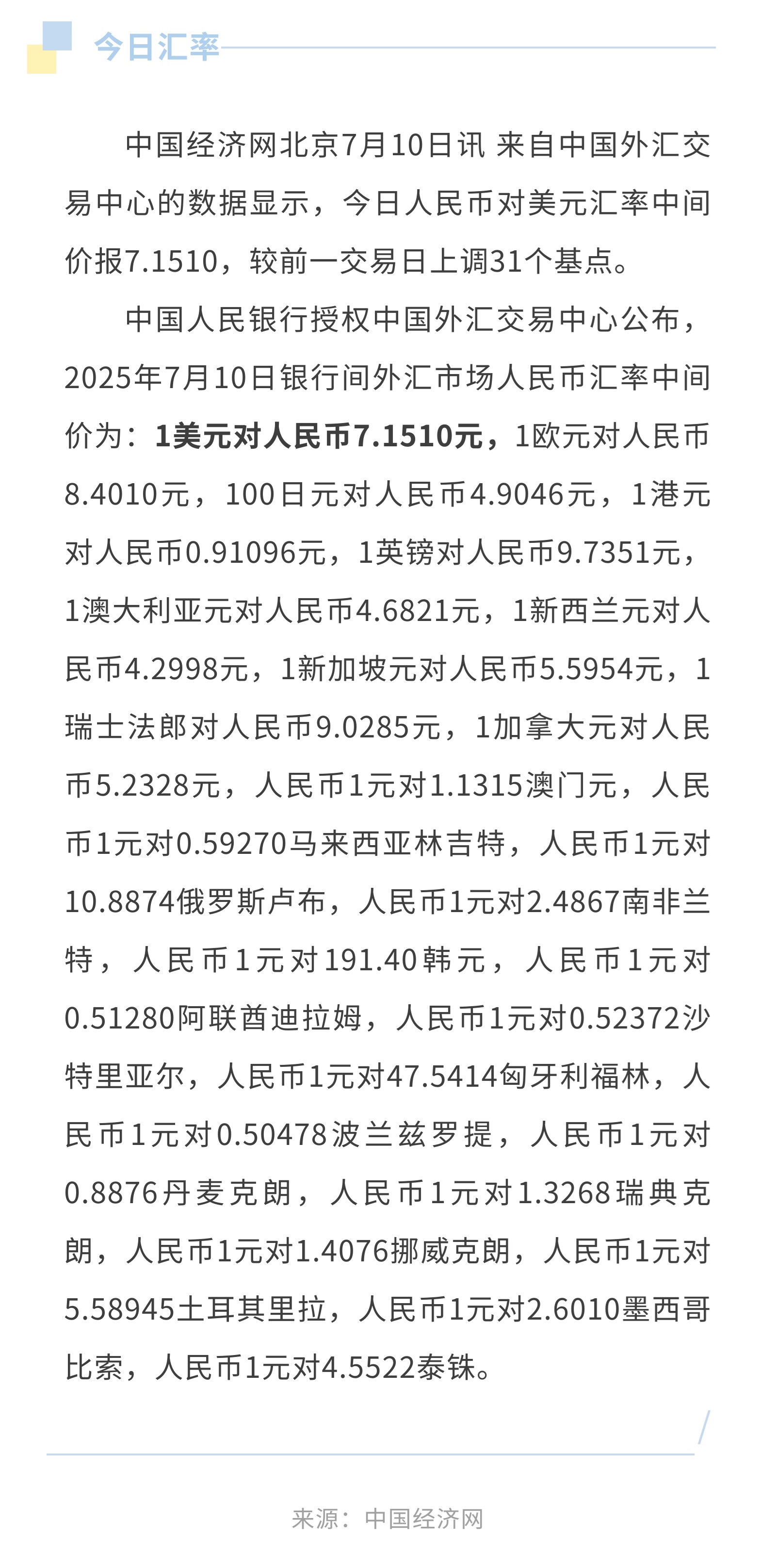 7月10日人民币兑美元中间价报7.1510,上调31个基点