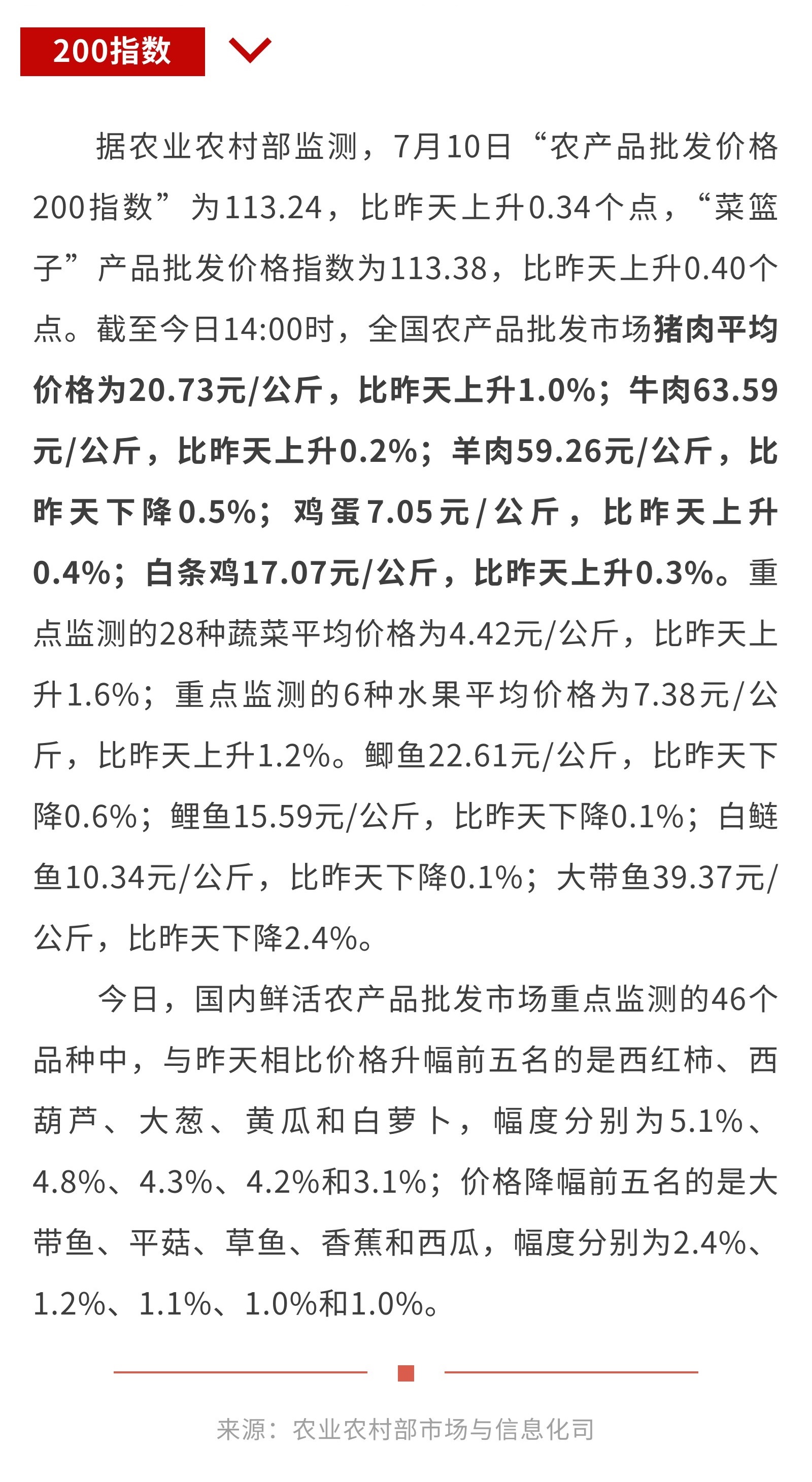 7月10日“农产品批发价格200指数”比昨天上升0.34个点