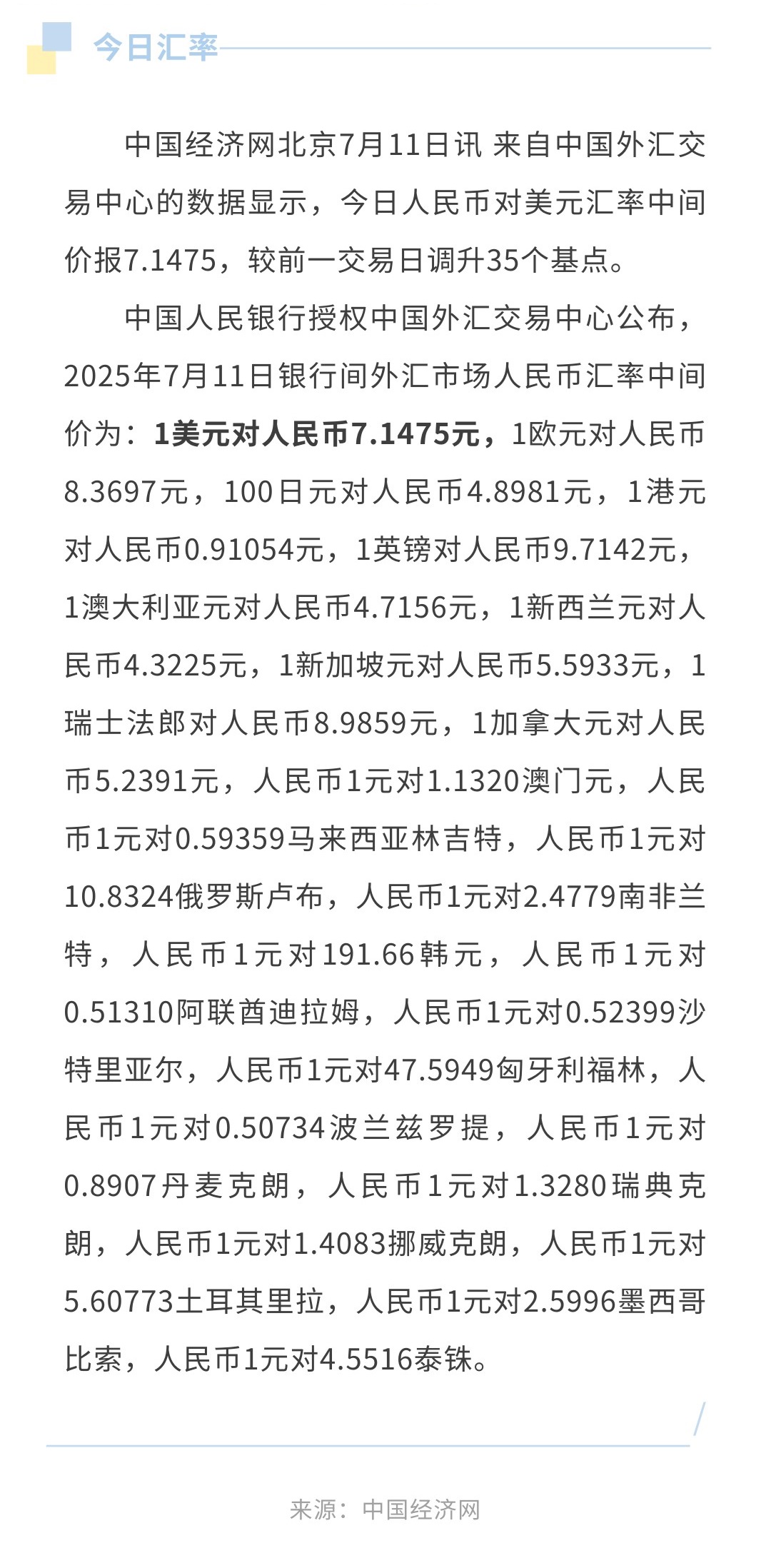 7月11日人民币兑美元中间价报7.1475,调升35个基点