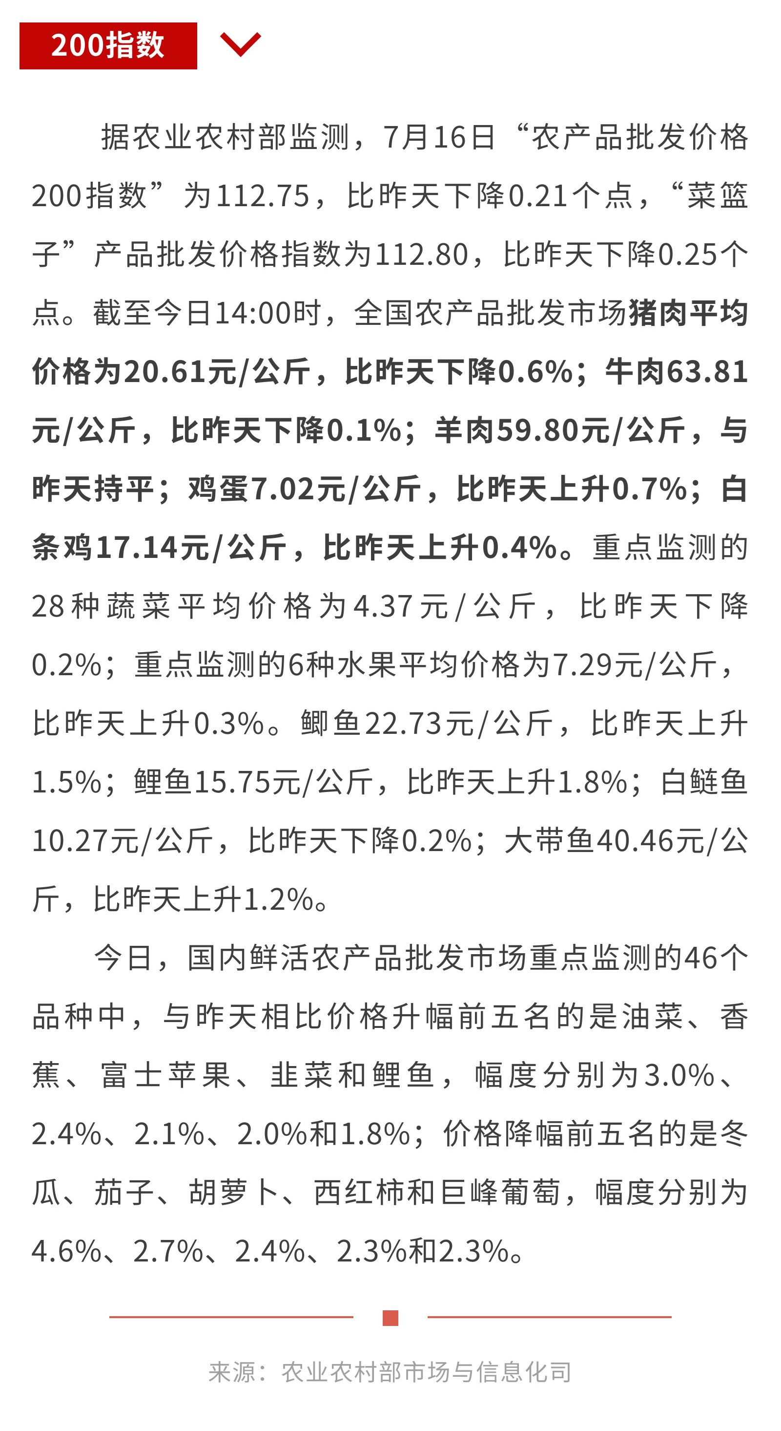 7月16日“农产品批发价格200指数”比昨天下降0.21个点