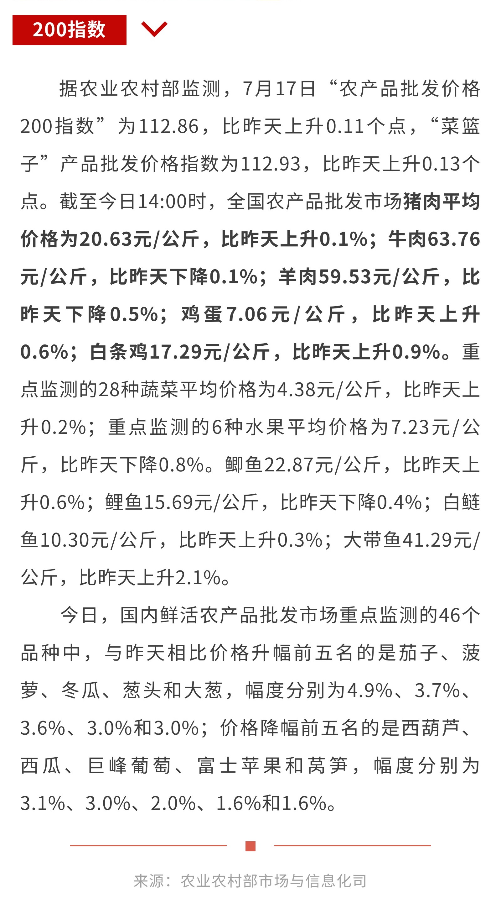 7月17日“农产品批发价格200指数”比昨天上升0.11个点