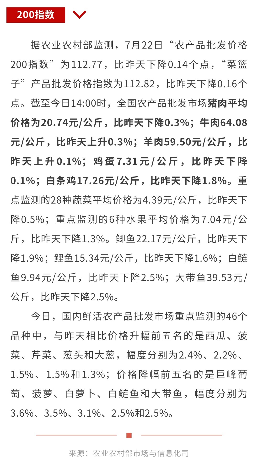 7月22日“农产品批发价格200指数”比昨天下降0.14个点