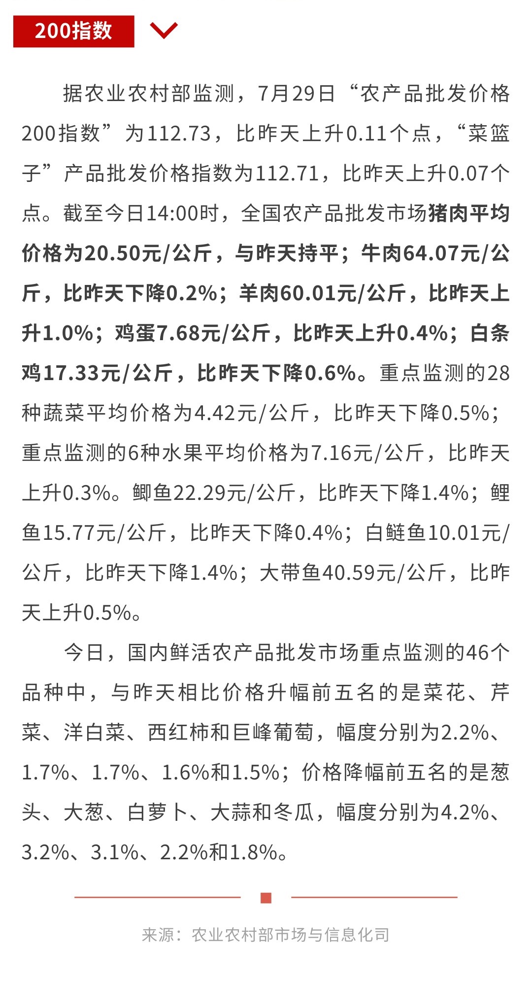 7月29日“农产品批发价格200指数”比昨天上升0.11个点