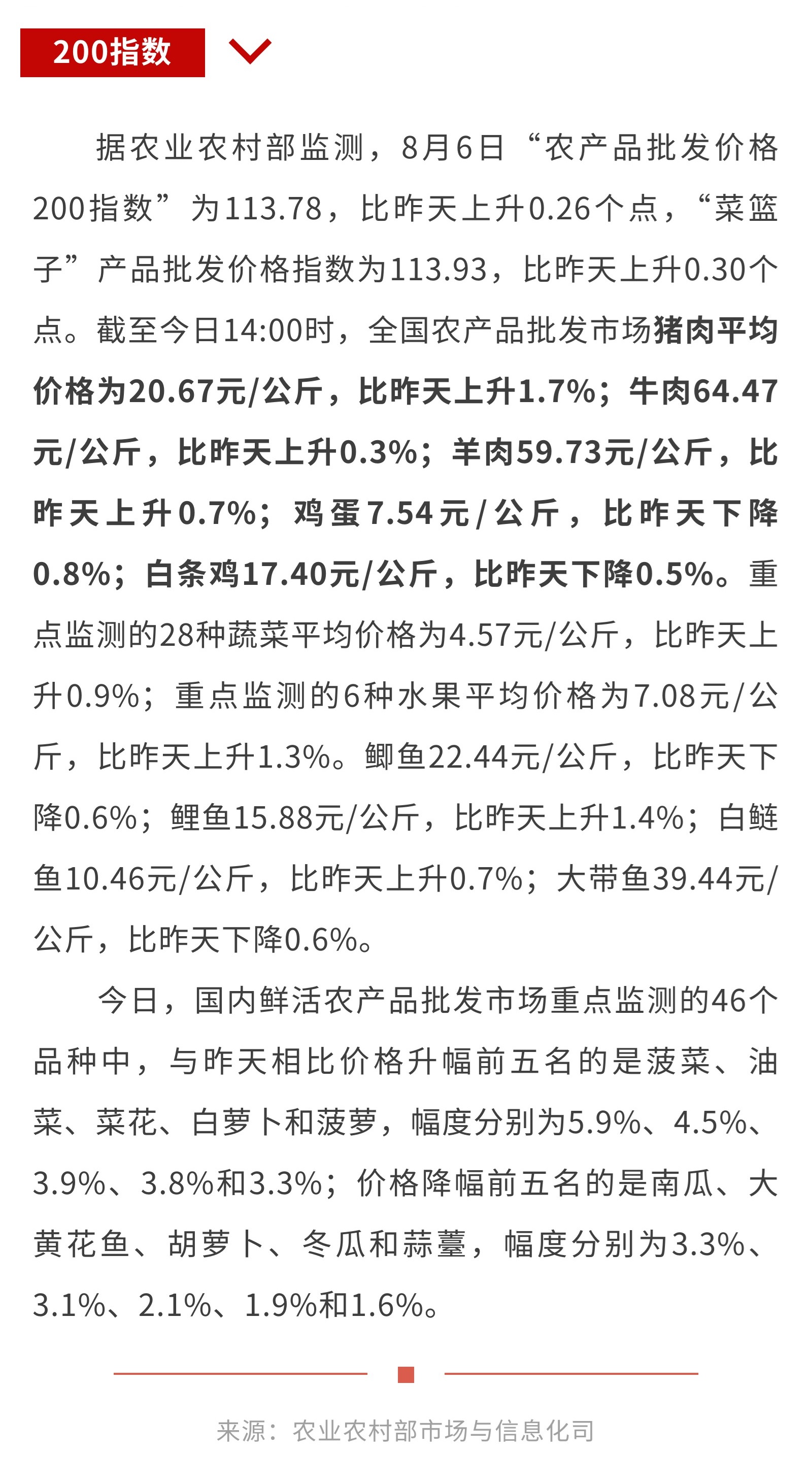 8月7日“农产品批发价格200指数”比昨天上升0.14个点