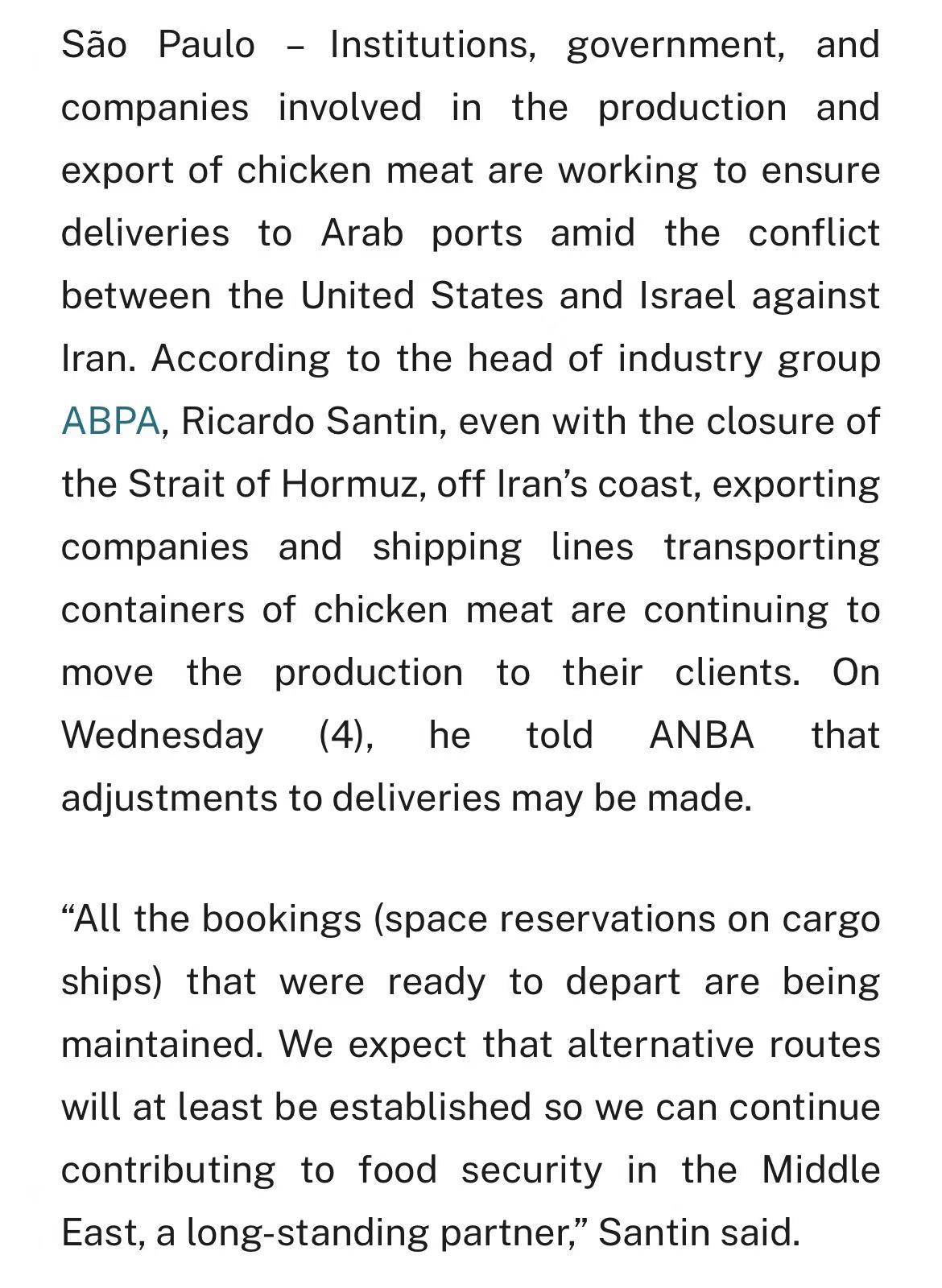 巴西动物蛋白协会(ABPA)主席桑廷最新表态:虽然霍尔木兹海峡局势紧张,但已预订的舱位继续执行,企业正在找替代路线。目前方案包括绕行曼德海峡、从阿曼萨拉拉港陆运、或在阿联酋东海岸卸货。