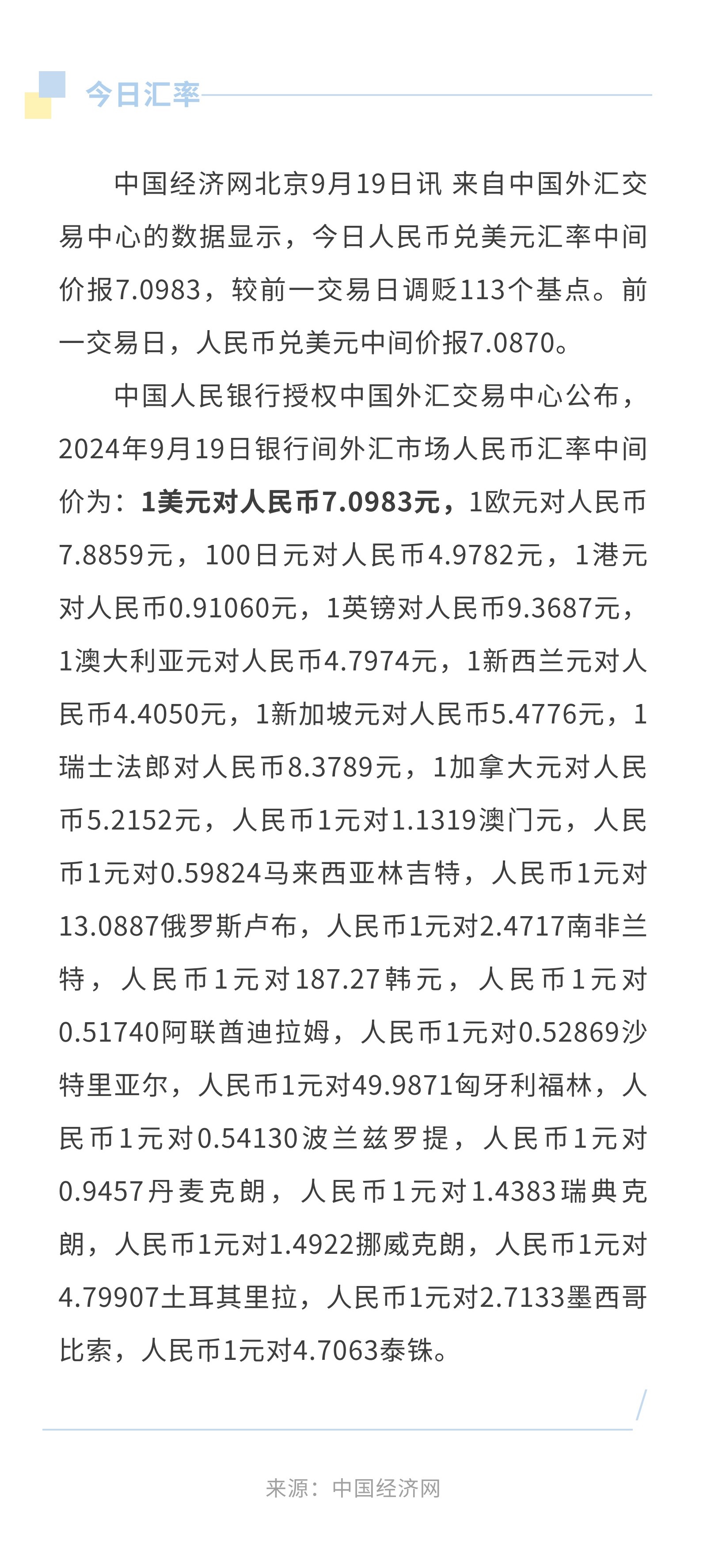 9月19日人民币兑美元中间价报7.0983,调贬113个基点