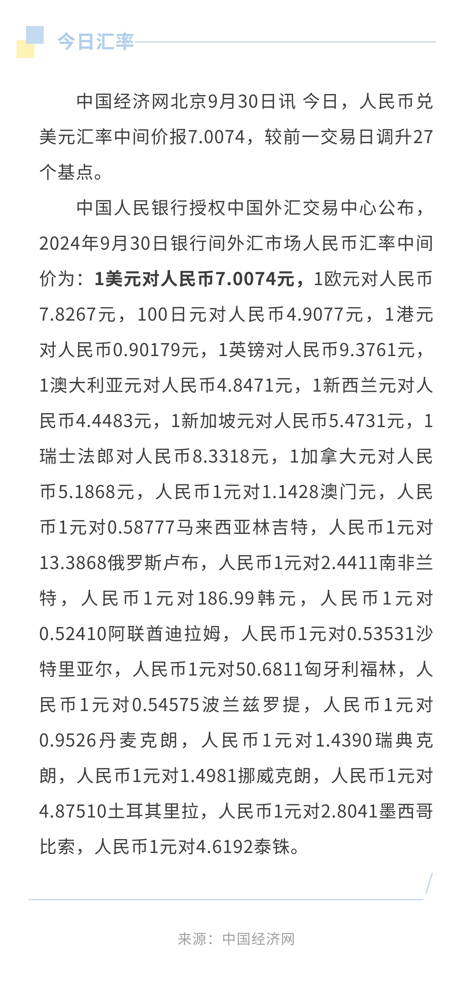 9月30日人民币兑美元中间价报7.0074,调升27个基点