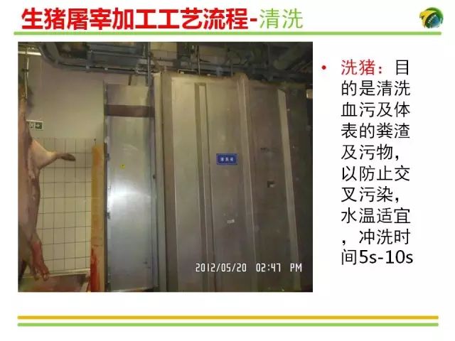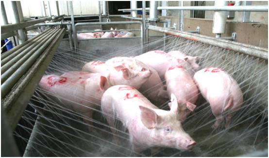 对送宰的生猪进行淋浴,确保猪只致昏前的清洁,淋浴水温根据季节的变化进行适当的调整,淋浴时间5-8min。