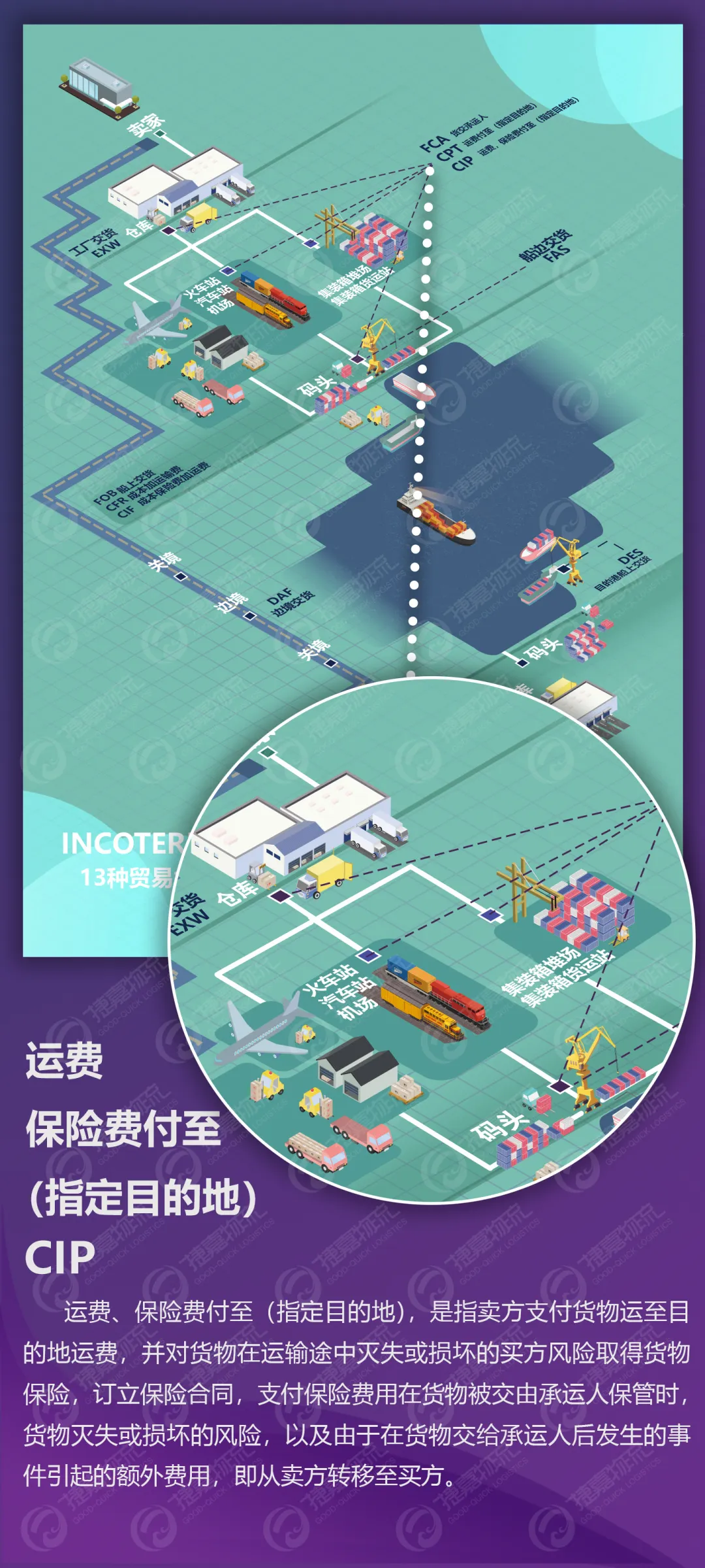 CIP(CARRIAGE AND INSURANCE PAID TO NAMED PLACE OF DESTINATION,缩写 CIP)在采用这一贸易术语时,至于风险的转移则与CPT术语一样,都是从卖方把货物交给承运人照管时起,即由卖方移转达于买方。