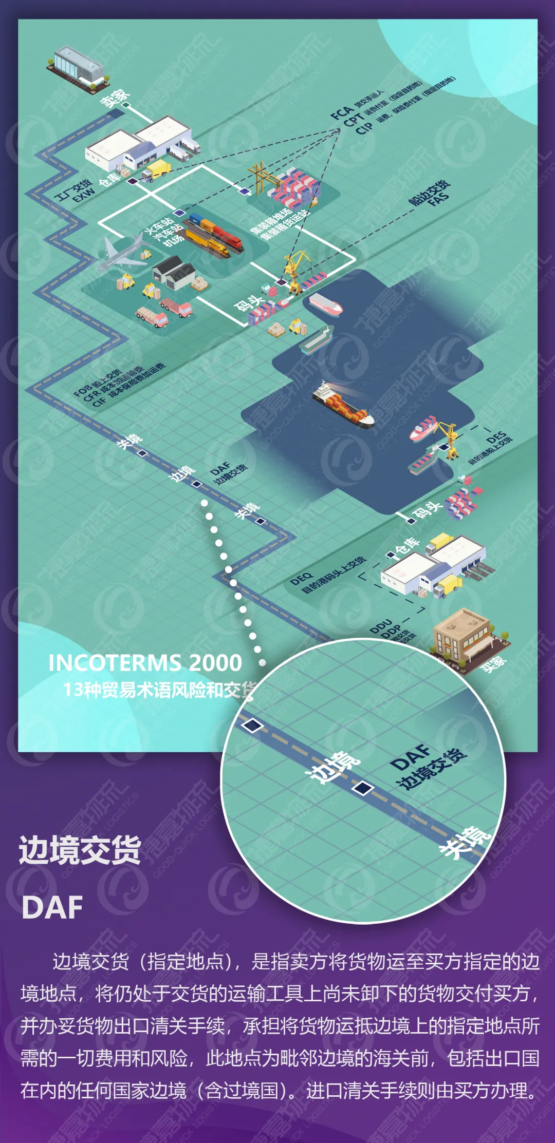 *该术语可用于陆地边界交货的各种运输方式,在边界有几个交货地点时,当事各方应明确商定其中一个地点为交货地,并在DAF之后具体说明,以避免在履约时发生争议。当在目的港船上或码头交货时,应用DES或DEQ术语。