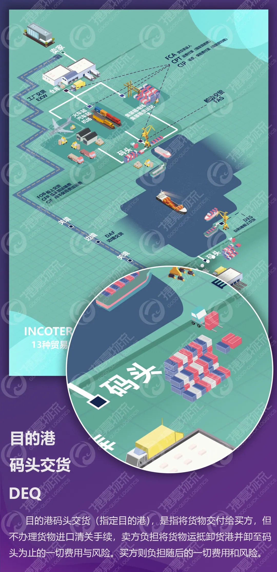 * DEQ国际贸易条件仅适用于海运、多式联运或内河运输等外贸运输方式,DEQ贸易条件仅适用于在目的港卸货的情况。