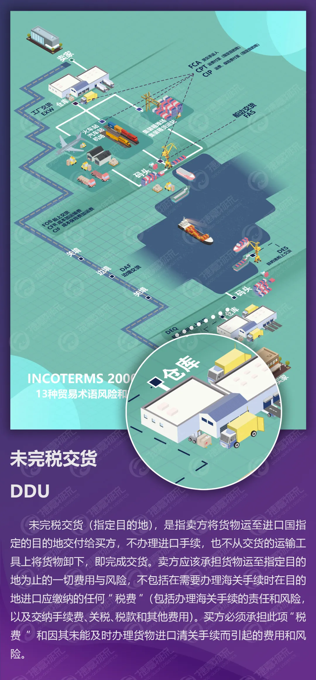 DDU指卖方负责租订运输工具,在规定的时间内将已清关货物运抵指定的目的地,在运输工具上交货并承担交货前的费用、风险的贸易术语。