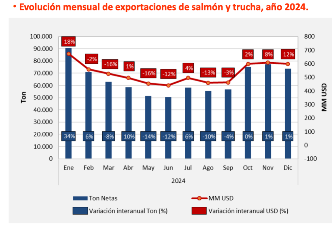 Clement称:“2024年智利全行业停滞不前,产量几乎没有增长,出口额下降,主要市场价格下跌,整体市场陷入低迷。前几年银鲑养殖量上升导致价格暴跌,现在情况有所好转。”