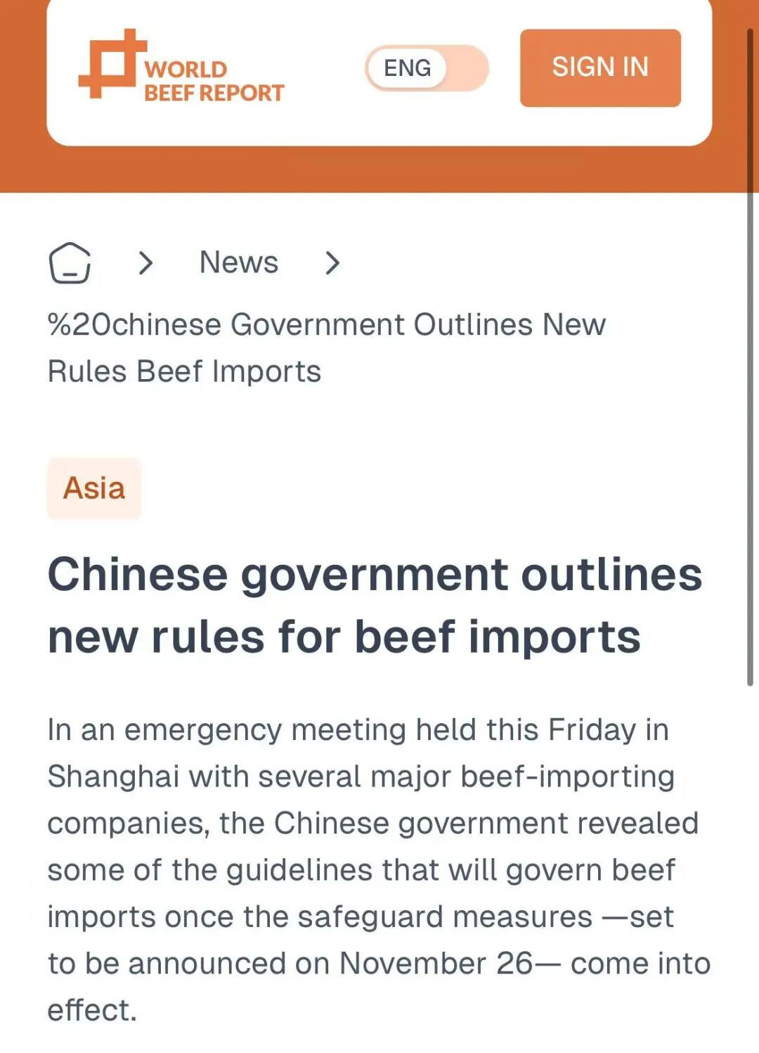 截至目前,中国官方尚未通过海关总署、商务部或农业农村部等权威渠道发布有关“11月26日实施牛肉进口配额”或“暂停部分加工厂输华资质”的正式公告。相关报道仍主要引自南美媒体,尚未获得中方证实。因此,有关牛肉进口新规的具体内容、实施范围与政策依据,仍需以中国政府后续发布的权威信息为准。我们也将持续关注,拭目以待。