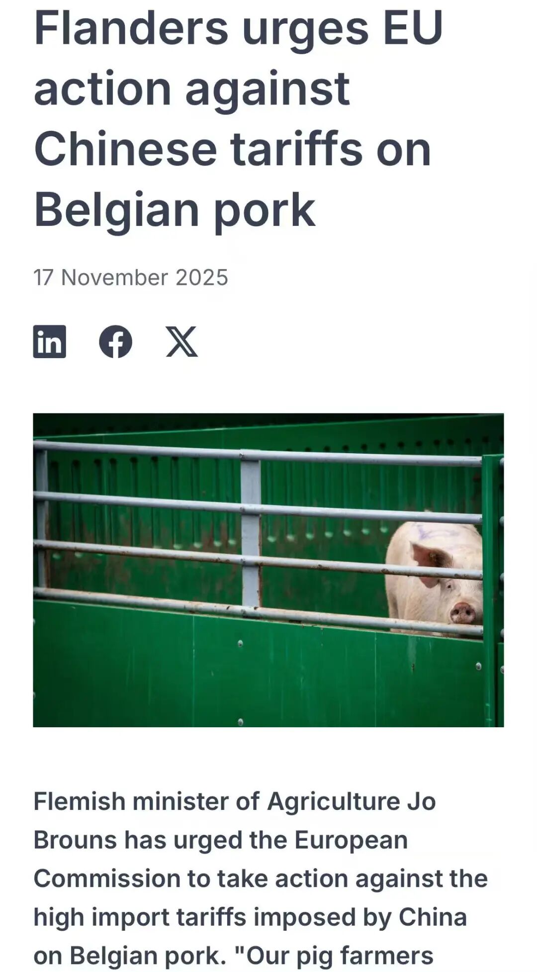 外媒消息,中国对比利时猪肉征收高额进口关税引发欧盟关注。比利时弗拉芒大区农业部长约·布朗斯呼吁欧盟委员会采取行动,指出当地养猪农户不应成为地缘政治贸易争端的牺牲品。