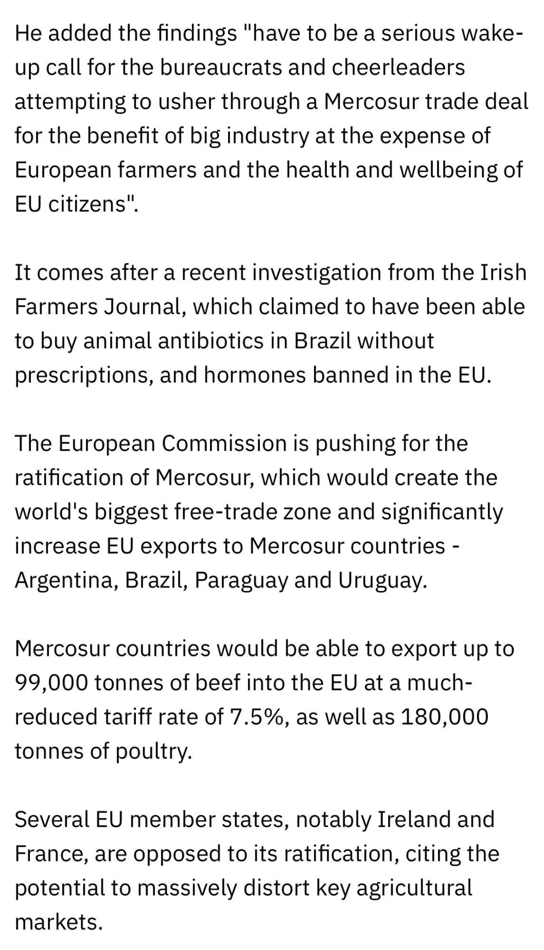 此次事件令巴西肉类监管体系再次受到质疑。爱尔兰农民协会指出,这暴露了巴西在屠宰场监管方面的严重不足,并警示欧盟正在推进的与南方共同市场(南共市)贸易协定可能带来风险——该协议拟以7.5%低关税向欧盟新增99,000吨南美牛肉进口配额,但欧洲农民担心其生产标准无法达到欧盟要求。
