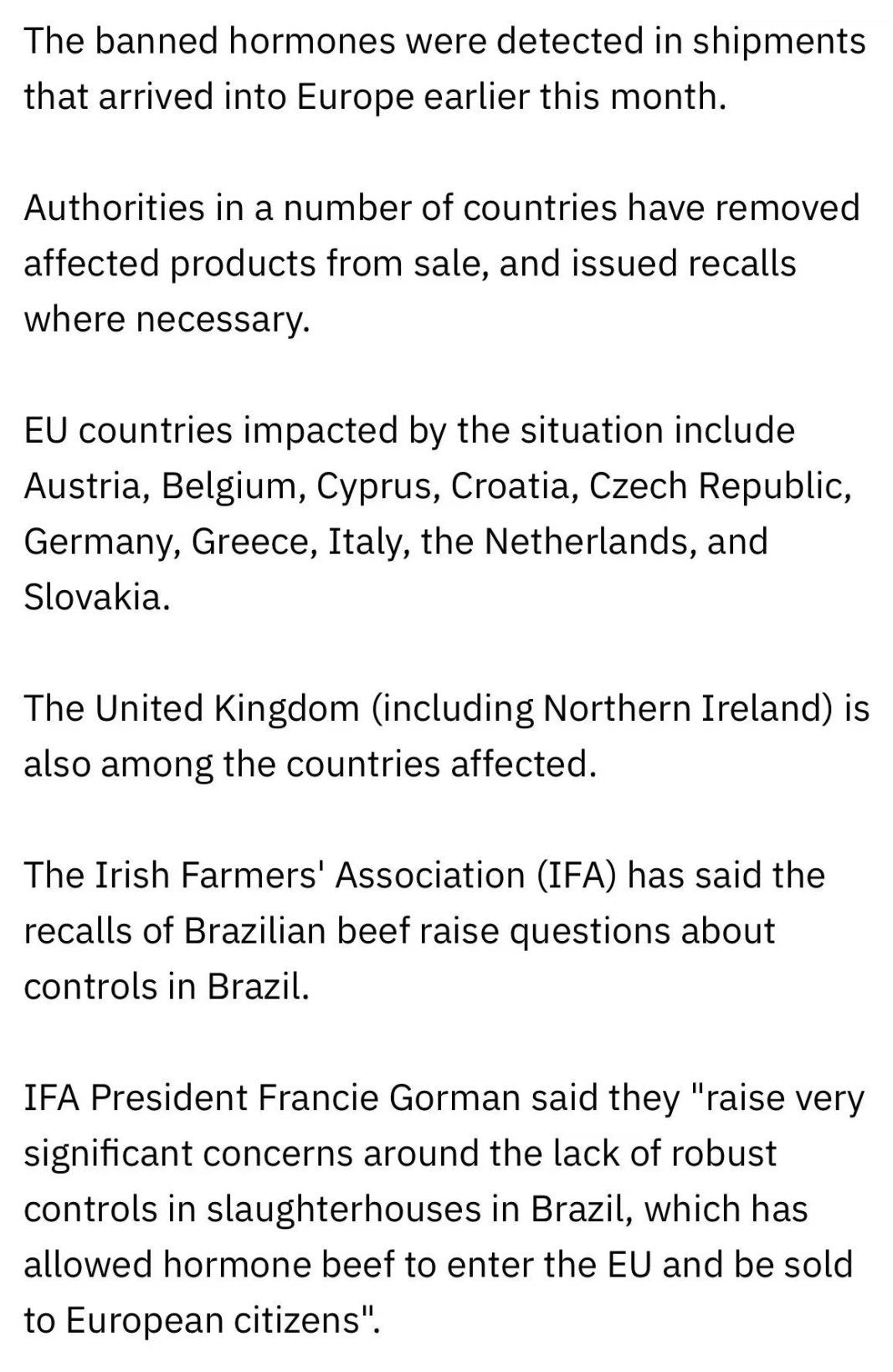 此前已有媒体调查显示,巴西可轻易购得欧盟禁用的动物激素,进一步加剧了各方对进口牛肉安全性的忧虑。目前欧盟内部对该贸易协定的反对声音因此加强,协议推进面临更大阻力。