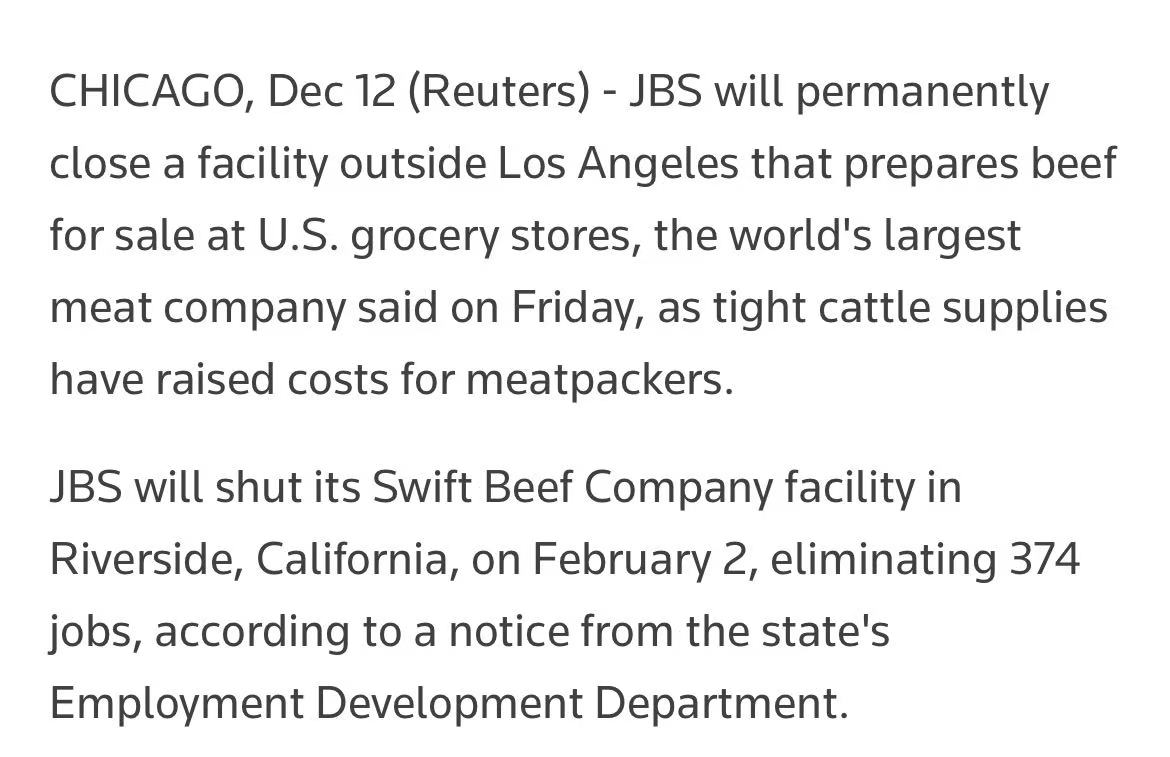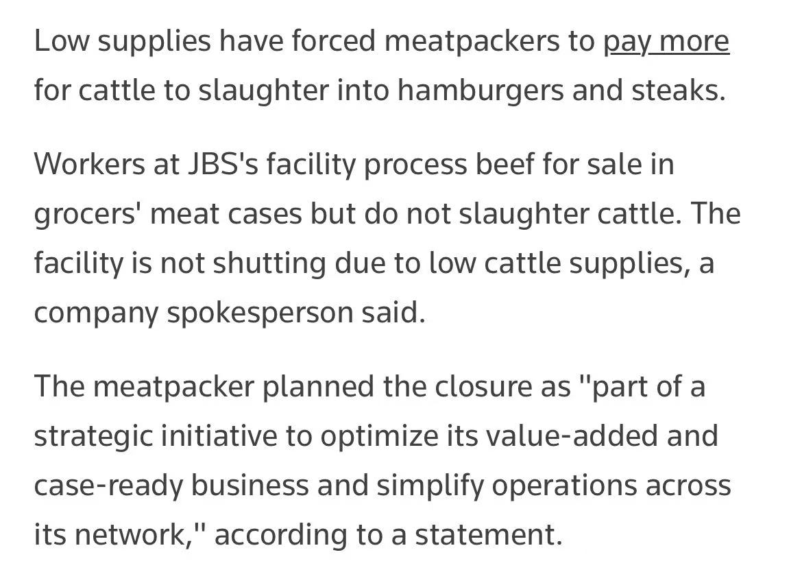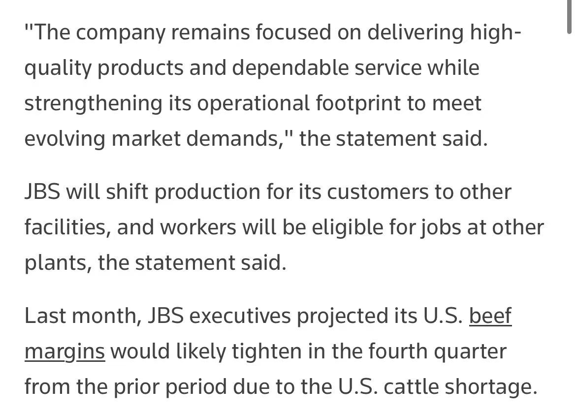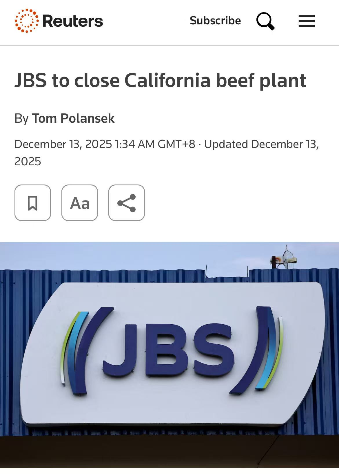 行业分析指出,美国牛肉供应链脆弱性凸显——产能不足、牧场主结构老化、缺乏战略储备机制等问题相互叠加,使得价格压力短期内难以缓解。市场预计,至少未来一至两年,牛肉价格仍将高位运行。JBS的工厂关闭,正是这一市场失衡状态下的一个缩影。