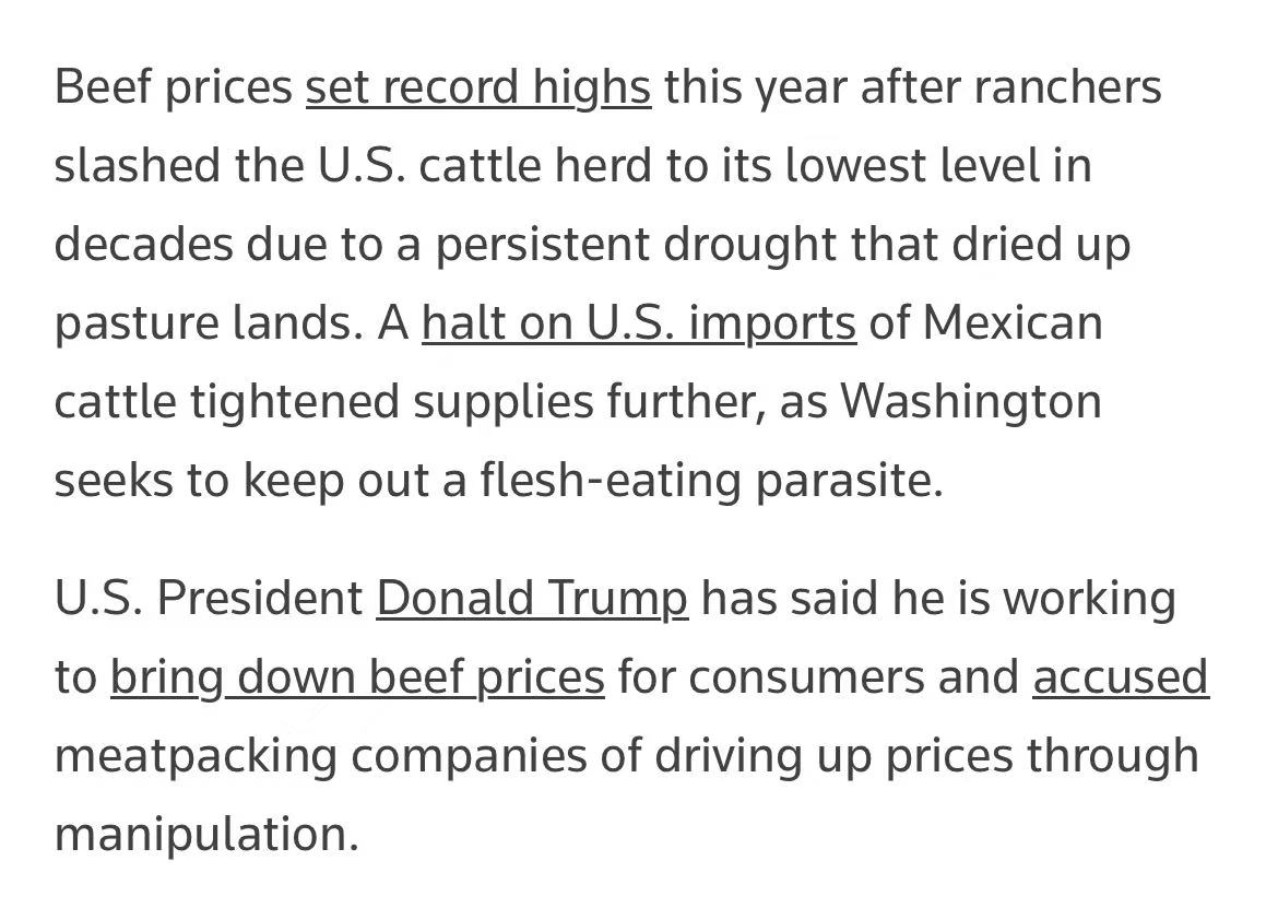 JBS强调,此次关闭是其优化预包装业务与运营网络的战略调整,并非直接由于牛源短缺。但背后折射出美国牛肉产业正面临的深层危机:受长期干旱影响,国内牛群数量已降至历史低位,而美墨边境因疫病防控暂停活牛进口,进一步加剧供应紧张。这导致屠宰成本攀升,牛肉价格持续创下新高。
