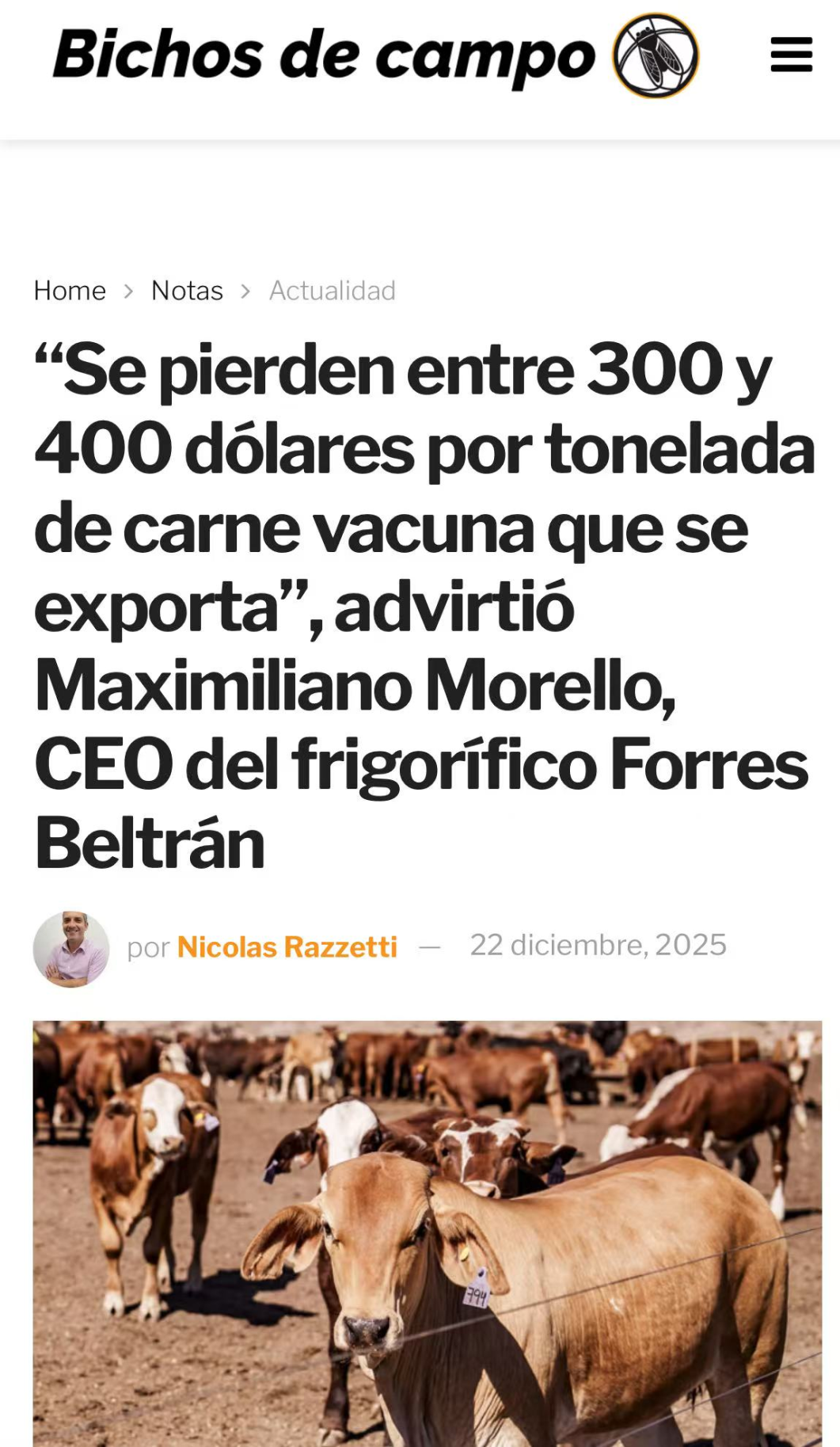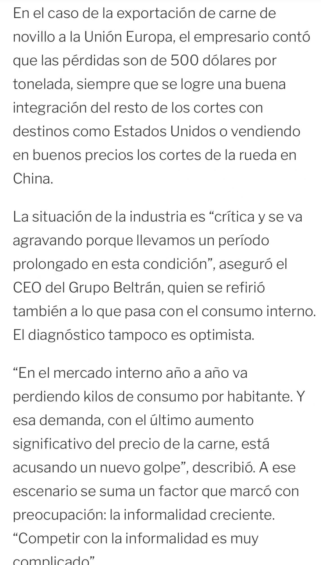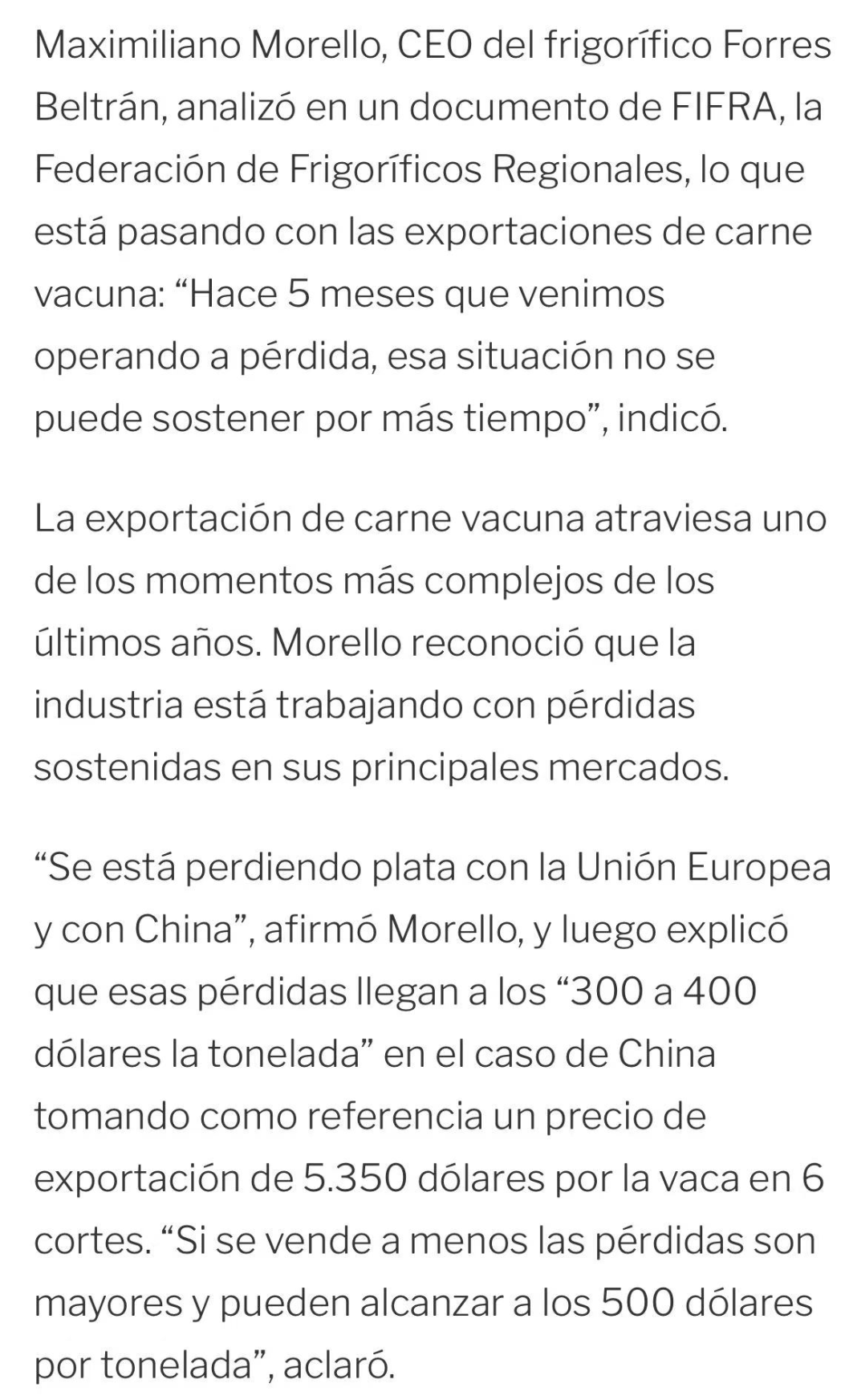 莫雷洛管理的Beltrán集团在阿根廷拥有八家加工厂及育肥场等全产业链资产。其旗舰工厂Forres Beltrán约60%产量用于出口。在国内外市场的双重挤压下,阿根廷牛肉出口商正面临艰难时刻。