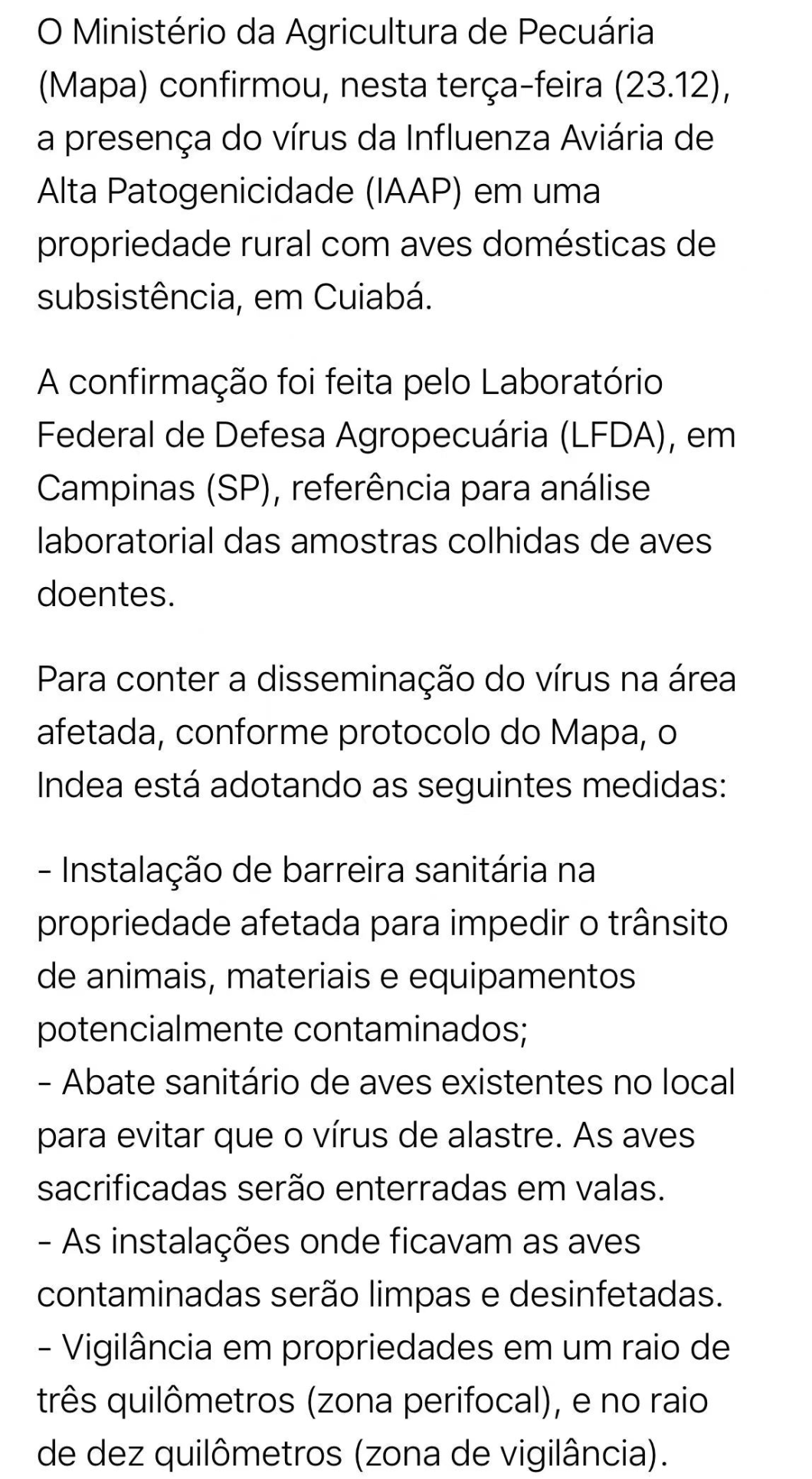 巴西农畜牧业部确认,在马托格罗索州库亚巴市一户散养家禽的农场中检出高致病性禽流感病毒。该结果由权威检测机构——位于坎皮纳斯的联邦农业防御实验室最终确认。