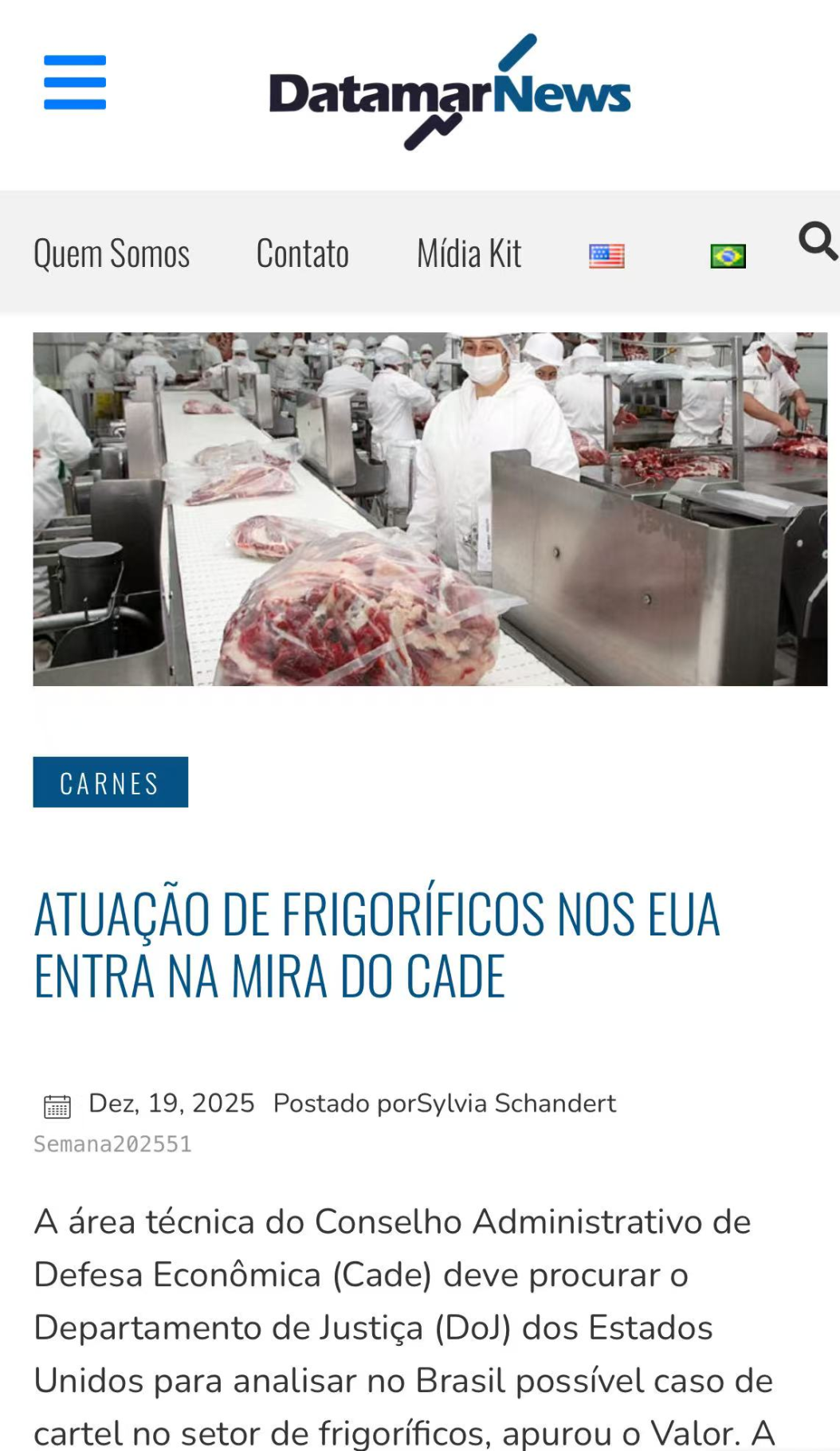 巴西反垄断机构CADE正考虑介入美国对肉类加工行业涉嫌垄断行为的调查。此前,巴西参议员致函CADE,指出美国总统特朗普已要求美国司法部调查外资控股企业可能存在的串谋定价行为,并特别提到巴西企业JBS与美国第四大肉类企业National Beef(由巴西Marfrig控股)在市场中的主导地位。