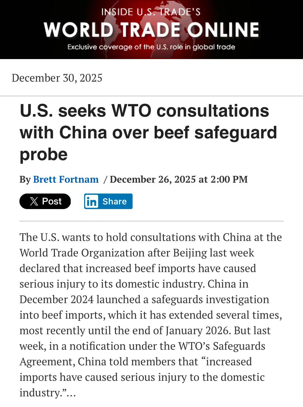 普悦 ·关注 | 美国就中方牛肉保障措施诉诸WTO磋商机制