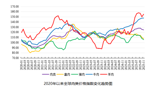 2025年11月份,FAO肉类价格指数小幅下降,其中,牛肉价格上涨,猪肉、羊肉、禽肉价格下降。FAO肉类价格指数(基期为2014—2016年)2024年1月份降至108.86后反弹,2025年11月份为124.58,环比跌0.8%,同比涨4.9%。
