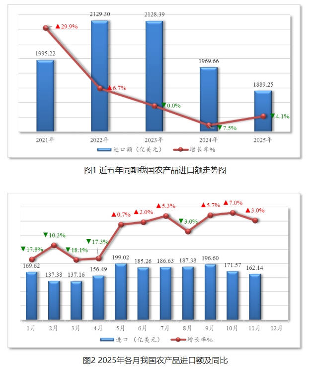 据海关统计,2025年1-11月,我国农产品进口总额1,889.2亿美元,比上年同期下降4.1%,进口规模为近五年同期最低。从月度走势来看,前4个月进口同比持续负增长,自5月起转为正增长,尤其是9月、10月和11月连续三个月保持正增长,显示下半年进口动能逐步有所恢复。
