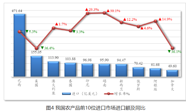 1-11月,我国农产品前十大进口市场进口额合计1,313.5亿美元,比上年同期下降5.7%,占我农产品进口总额69.5%。巴西继续保持我农产品第一大进口来源地,进口额占比25%,但同比下降5.3%。美国、加拿大进口大幅收缩,同比降幅均超过36%。而越南、印尼进口额同比分别大幅增长30.1%和29.3%,阿根廷和新西兰也实现两位数增长。此外,澳大利亚和俄罗斯保持小幅增长,泰国则小幅下降3.3%。