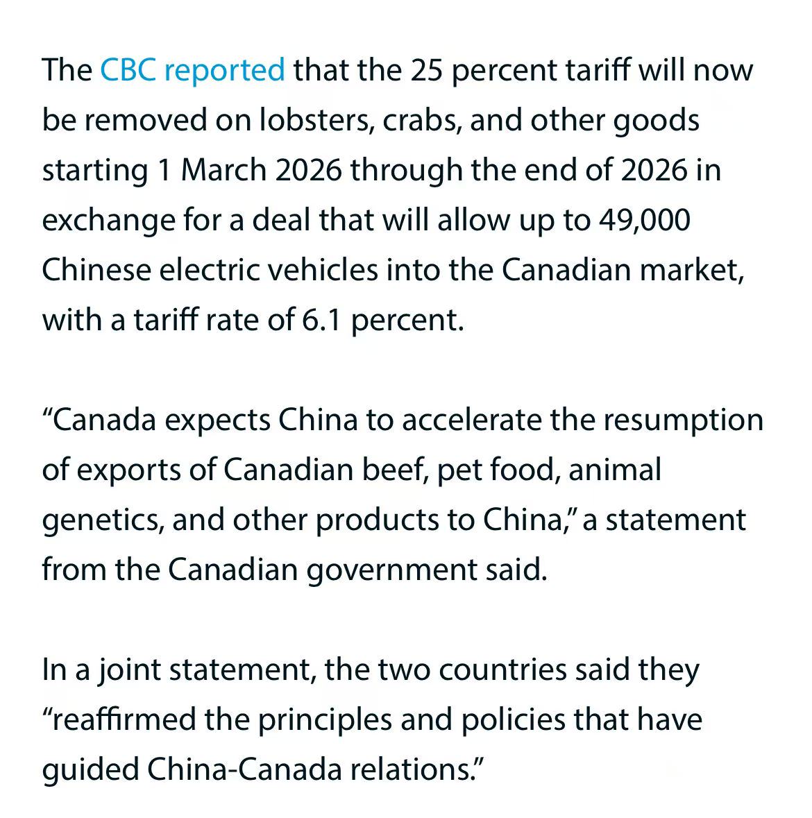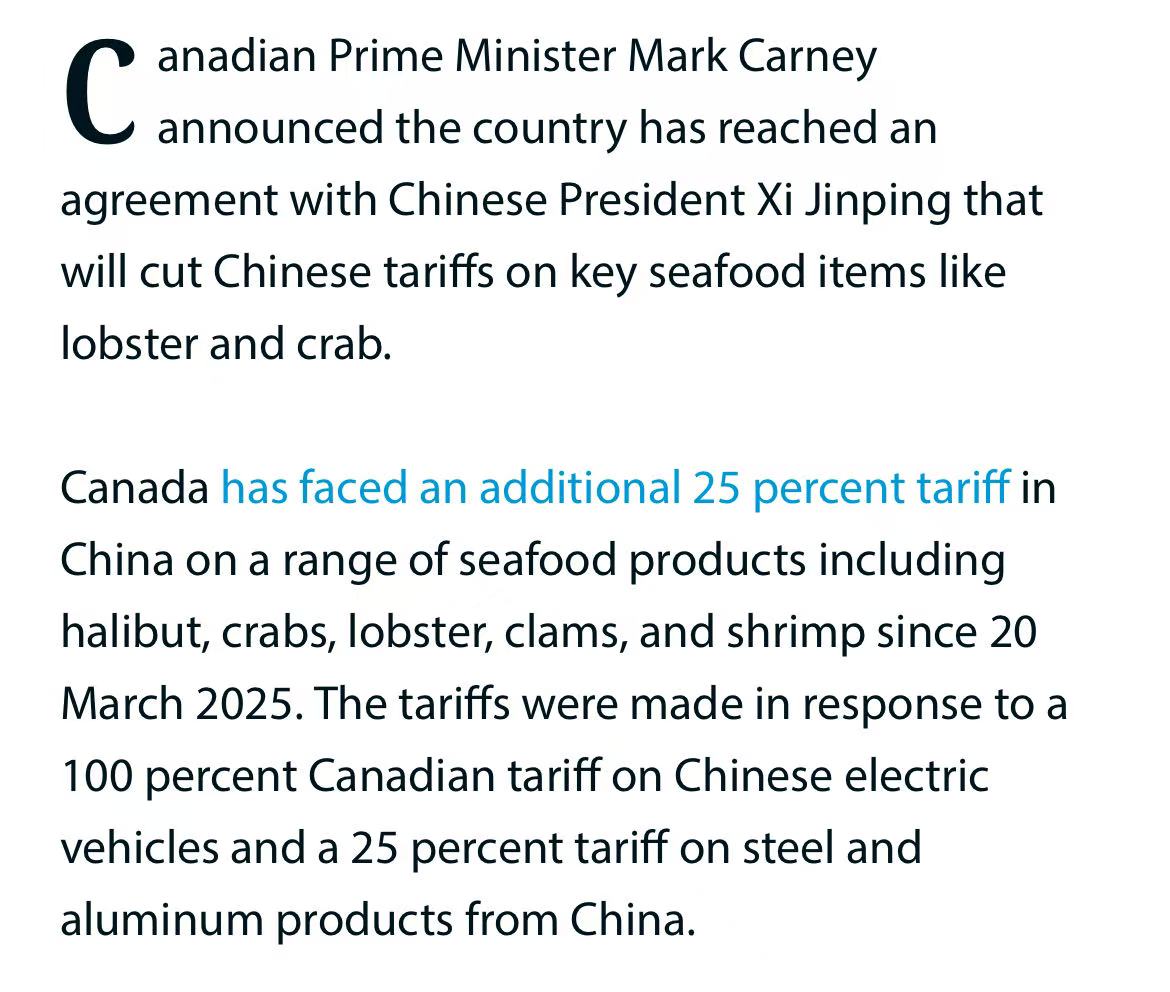 中加两国政府先后释放信息:自2026年3月1日至12月31日,中国拟取消对加拿大龙虾、螃蟹等海产品加征的25%关税;作为交换,加拿大允许最多49,000辆中国电动汽车以6.1%低关税进入其市场。