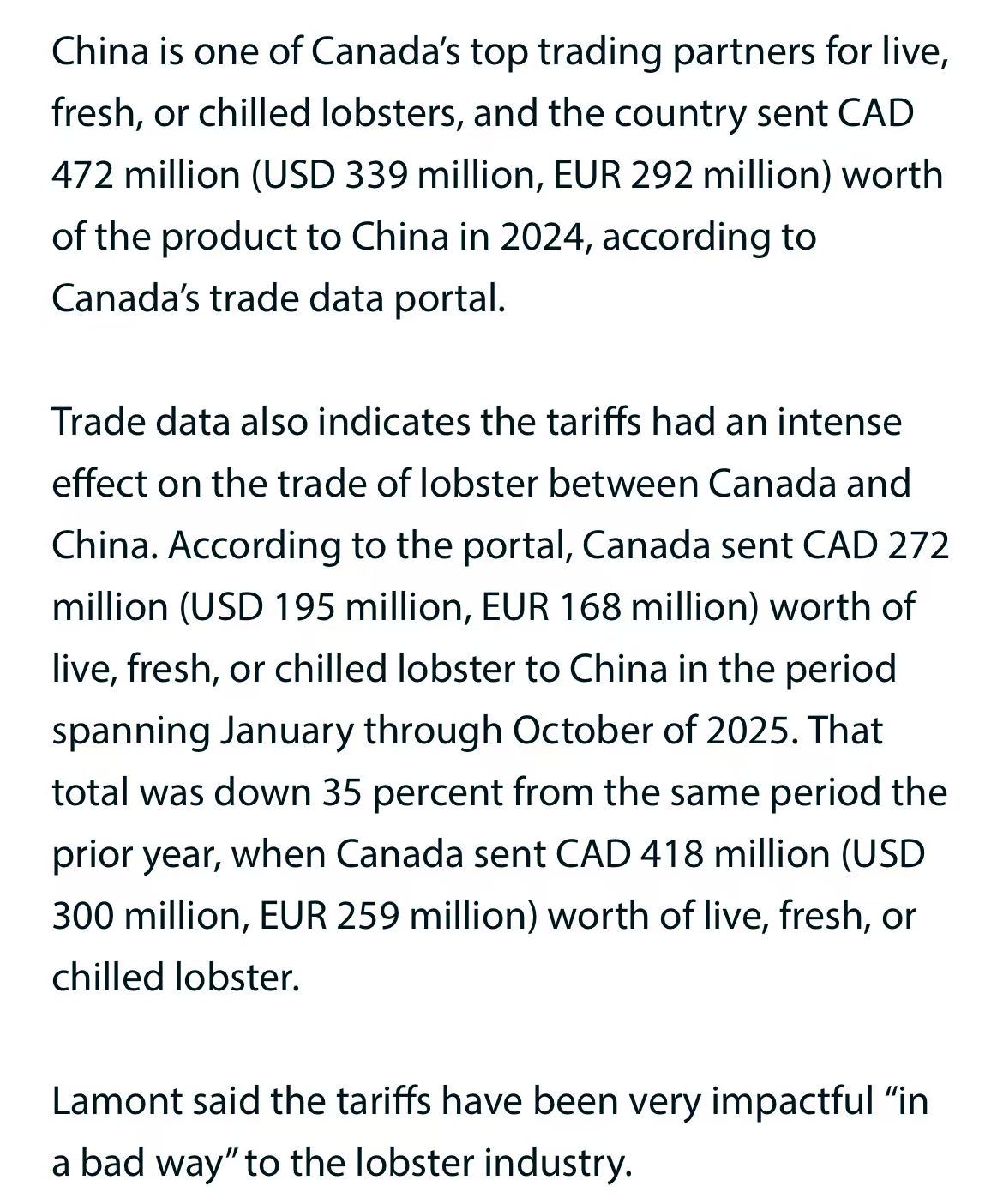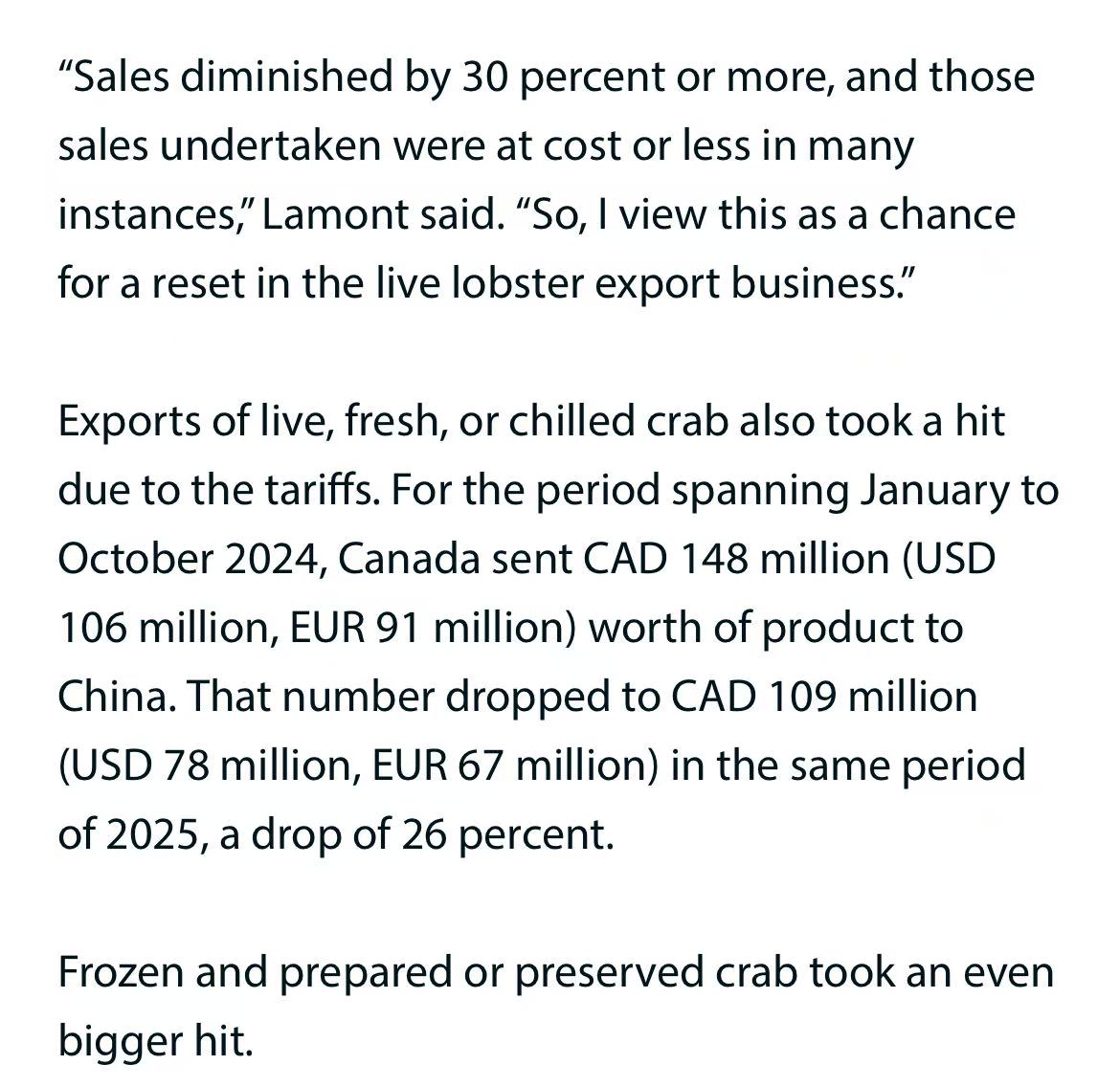 若消息落地,加拿大龙虾出口有望快速回血。2025年1—10月,加拿大对华鲜活龙虾出口额同比跌35%至2.72亿加元,局部码头价一度跌破成本线。关税消息传出后,新斯科舍省Fundy湾现货价已反弹至每磅12.5加元。