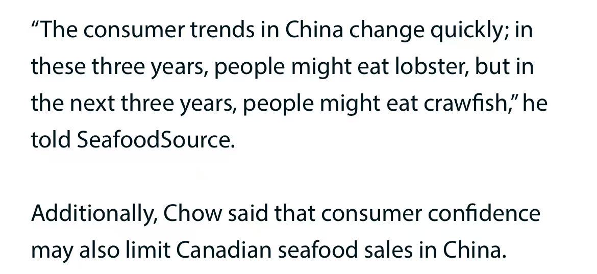 然而,多位行业专家对此持谨慎态度,认为加拿大海产品想重新赢回中国市场面临严峻挑战。主要阻力来自两方面:一是激烈的价格与品类竞争,越南龙虾、俄罗斯帝王蟹以及澳大利亚和印度的产品已占据相当市场份额;二是中国消费市场本身的变化,包括消费趋势快速更替、当前经济环境下餐饮消费收紧等因素,都可能限制需求反弹。